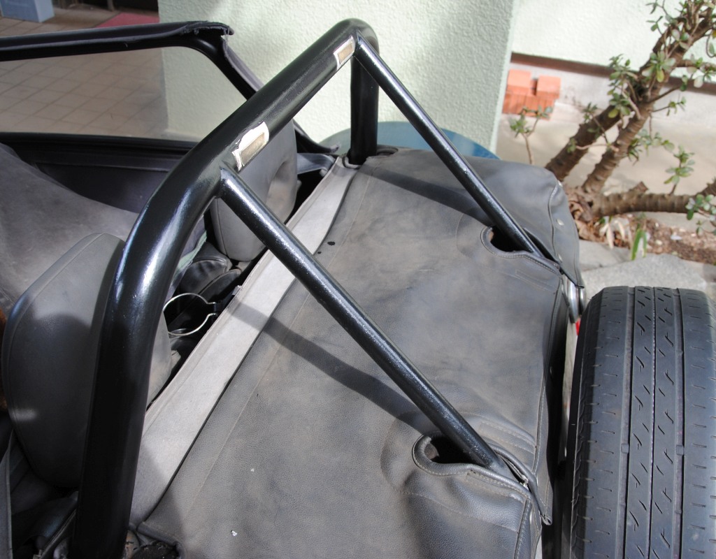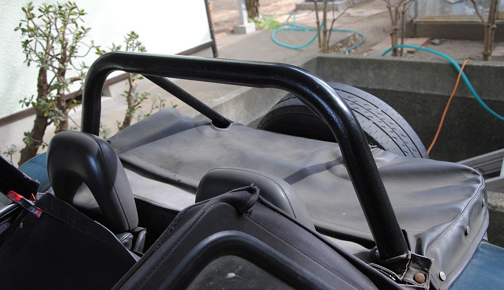 As a countermeasure to long touring under the blazing hot sun in the summer, I purchased white canvas top (so-called "Bikini Top" in Japanese). Two silhouettes of my Birkin at a scenic overlook at the Lake Motosu (the parking lot of the prefectural R.71), New canvas top 1 (Lake Motosu on the left edge), New canvas top 2 (caudal view). In fact, visibility of twelve o'clock high is hidden, impairing the liberating feeling peculiar to the open two seater. It is the trade-off between fatigue from sunburn vs. fun to drive.