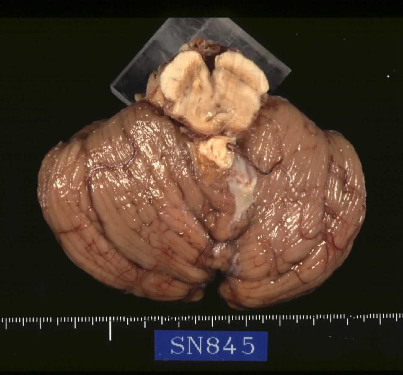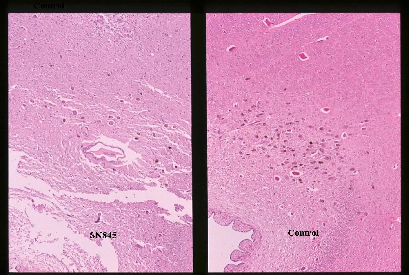 2. Brain, which weighs 1,265 gram inclusively, externally shows marked softening of both the inferior aspect of the cerebral hemispheres, particularly extensive anemic necrosis (infarct) of the inferomedial aspect of the bilateral temporal and occipital lobes. Sections in the coronal plane reveal extensive infarct involving the inferomedial surface of the occipital lobes including optic radiation, bilateral Ammon's horn, hypothalamus, and the left globus pallidus and internal capsule( [jpg.43KB]). Meynert nuclei are also involved. Only minimal arteriosclerosis is noted in the basilar and vertebral arteries. Substantia nigra macroscopically remains pigmented but in decreased intensity ( [jpg.56KB]). Microscopic examination reveals anemic necrosis with mobilization of foam macrophages, lymphocytic infiltrates, capillary proliferation and reactive astrocytosis at the margins of the infarct, which also is involving the substantia nigra and the mid pons slightly. A few Lewy bodies are identified in the pigmented nuclei of the substantia nigra ( [jpg.66KB]) and the nucleus tractus solitarii but none in the locus coeruleus, nucleus dorsalis n. vagi, neither in the cerebral cortex. The number of pigmented neuronal cells is decreased in substantia nigra ( [jpg.80KB]) and locus coeruleus ( [jpg.98KB]) compared with an age- and sex-matched control (SN 847, 70-year-old male), accompanied with scattered pigment-laden macrophages. Lipofuscin deposition in the cytoplasm of the neuronal cells is remarkable in the cerebral cortex. Neuronal cells of the reticular formation including those in the nuclei ambiguus of the medulla oblongata are intact. Pallor of the bilateral pyramids is noticed in the pons and medulla oblongata, moderate, the left side being more prominent, and in the upper cervical spinal cord, mild.