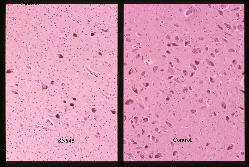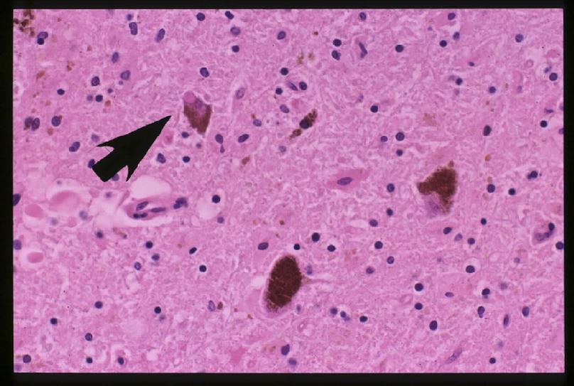 substantia nigra and locus coeruleus are remaining grossly, but the microscopic