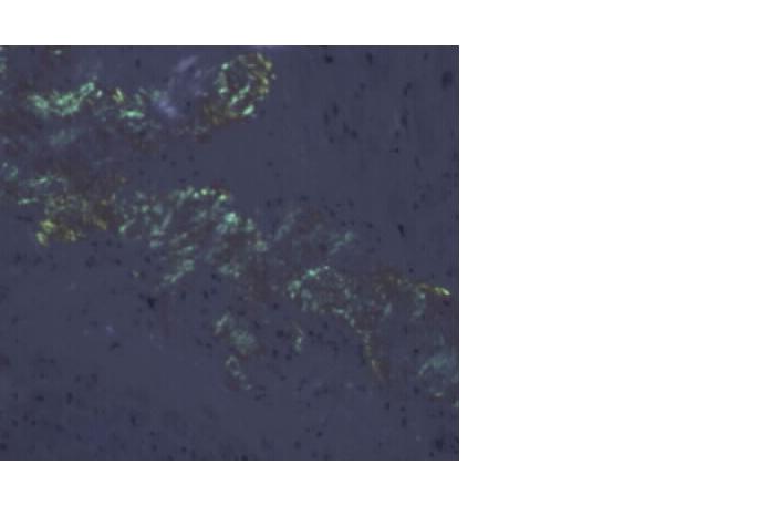 Amyloid deposition is confirmed by Congo-red stain with positive birefringence regarding the colonic and gastric specimens.