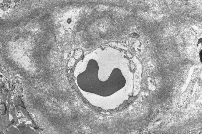 4. Electron microscopic investigation of the myocardium reveals the deposition of electron-dense substance, which is composed of randomly oriented, non-branching, less-than-10 nm diameter fibrils, in the perivascular spaces ([jpg.74KB]) and around the isolated myocytes. The analysis of the renal cortex, too, reveals focal deposition of the fibrils of the similar characteristics in the mesangial matrix that is not necessarily expanding. The glomerular basement membrane is not thickened, i.e., 250 nm, and free of electron-dense deposits. The slit membrane between the foot processes of the podocytes is confirmed to be intact, the foot process fusion not being observed.