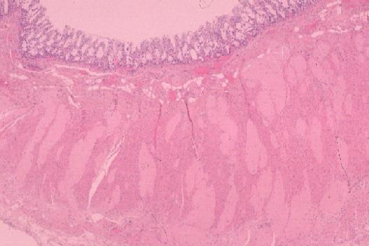 b. The esophagus, stomach and intestines are otherwise unremarkable to the naked eye than mild mucosal petechia of the stomach with bloody content that measures about 100 ml in volume. Microscopic examination reveals diffuse and patchy deposition of amyloid substance mainly in the smooth muscle layer but also in the muscularis mucosae and submucosa of those organs (Sigmoid, HE stain [jpg.26KB]).
