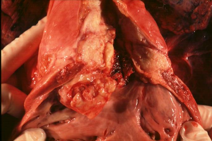 1. Intimal sarcoma of the pulmonary artery, post-operative recurrence, involving the main trunk, bilateral main branches and the left atrium. (OMH 98-0339)