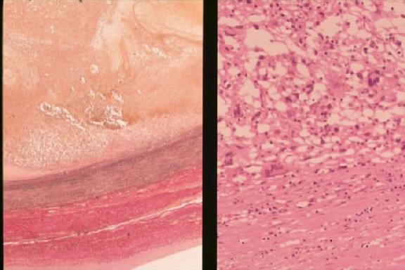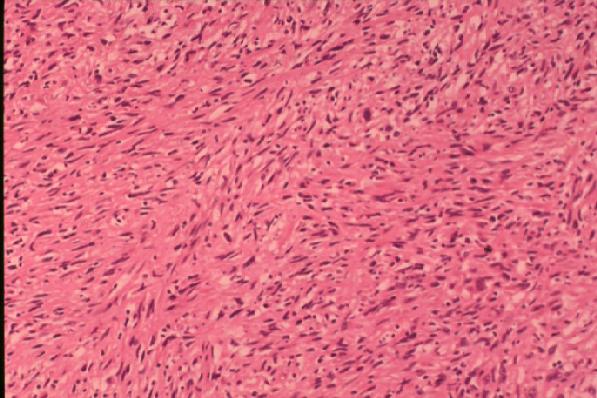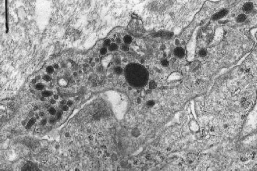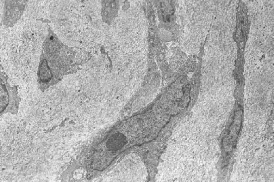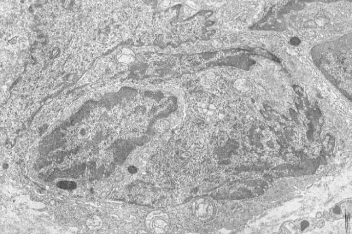 Operation specimen (jpg.20KB) (OMH 98-0339): Primary pulmonary artery sarcoma, open thoracic surgery - intimal sarcoma (HE stain [jpg.44KB]), with involvement of the pulmonary valve. Electron microscopic examination reveals elongated cells (jpg.52KB) and occasionally multipolar giant cells (jpg.75KB) with irregulary indented nuclei, whose cytoplasm contains electron-dense inclusion bodies that measure 500 nm in largest diameter (jpg.46KB), suggesting of lysozomal origin but being somewhat similar to neurosecretory granules. No basal lamina is formed near the tumor cells.