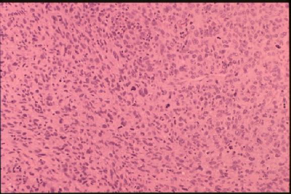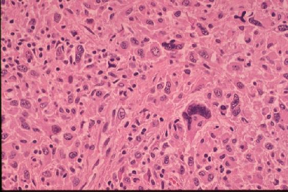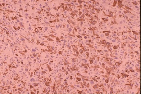 2. The left pleura is firmly adherent to the chest wall, and 330 ml of yellow pleural effusion is present in the left pleural cavity and 400 ml in the right. Pericardial space is firmly adhered. An elastic firm and smooth surfaced tumor is noted around the main trunk of the pulmonary artery (PA) and its main branches that measures about 9 x 6 x 5 cm in external dimension inclusively, accompanying a dumb-bell shaped, apparently separate mass on the posterior aspect of the left atrium that measures 8 x 6 x 3 cm in dimension. Anterior incision through right ventricular outflow tract and pulmonary trunk (jpg.43KB) reveals a tumor thrombus occupying the lumen of the main trunk and bilateral branches of the PA (elastic van Gieson and HE stains [jpg.34KB]), measuring about 7 x 4 x 3 cm in dimension, which in a retrograde fashion protrudes from the outlet at the level of the pulmonary valve into the lumen of the dilated right ventricle that measures 3.5 x 3.5 cm in dimension with smooth surface, and distally involves the upper lobe branch of the right PA 4.0 cm long from the hilus, and the upper and lower lobe branches of the left PA massively. The lumen of the right lower lobe branch of the right PA is free of invasion. The stent, which is consisting of four tandemly and one parallelly arranged metal pieces fairly evenly implanted in the lumen from the pulmonary valve to the hilum of the right PA, is being completely embedded in the tumor thrombus. The lumen of the stent, too, is almost completely obstructed by organizing tumor thrombus. On cut surface at the anterior aspect of the main PA, where the tumor is invading its wall and forming a nodular sessile mass that measures about 6 x 3.5 x 4 cm in dimension, the tumor is yellowish white, solid and uniform. The remaining thread from the previous operation is also identified there. The esophagus and ascending thoracic aorta and other mediastinal structures are free of involvement. Microscopic examination reveals diffuse proliferation of atypical spindle cells arranged in storiform pattern (ordinary type) (jpg.45KB) or diffuse proliferation of pleomorphic giant cells, including bizarre multinucleated giant cells (giant cell type) (jpg.47KB). Immunostains reveal distinct positivity of tumor cells for vimentin (jpg.44KB), questionable positivity for lysozyme, S-100 and alpha-1-anti-trypsin, and negative staining for desmin and SMA.