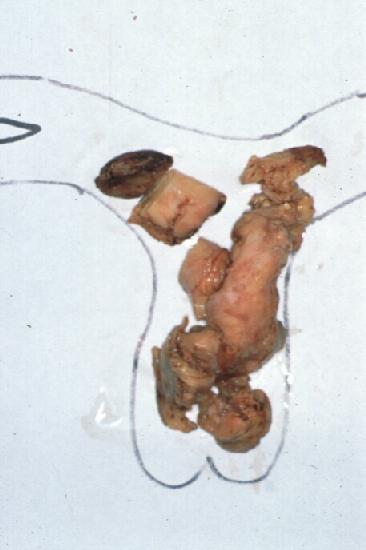 1. The cadaver is in state after resection of the intimal sarcoma of the pulmonary artery, performed on February 9 1998. Median incision scar of the anterior thoracic wall is noted at autopsy.