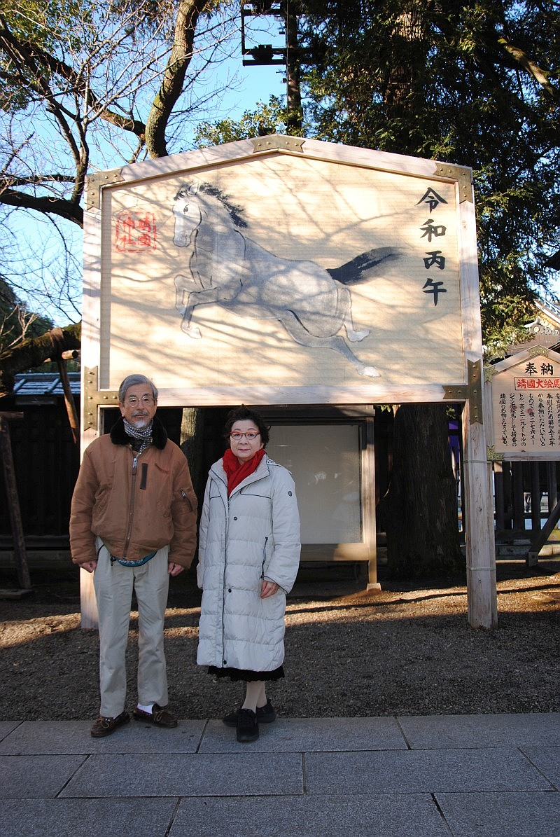 This year is Horse year on the rotation of the 12 zodiac animal signs. In front of the main hall (Haiden) - Photo-1, we pay respect for the KIA soldiers of Nippon and throw a coin into the offering box. Mildly snow-covered main hall (Haiden) - Photo-2 . Platform stage for taking a ceremonial photograph - Photo-3.