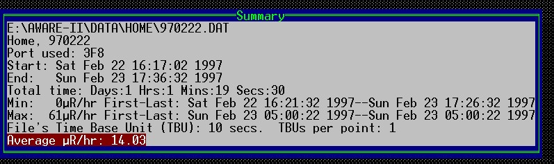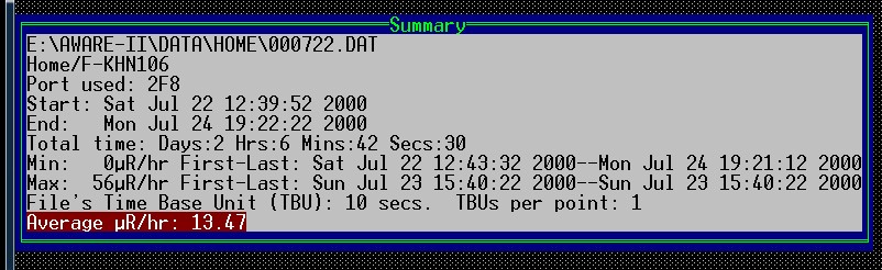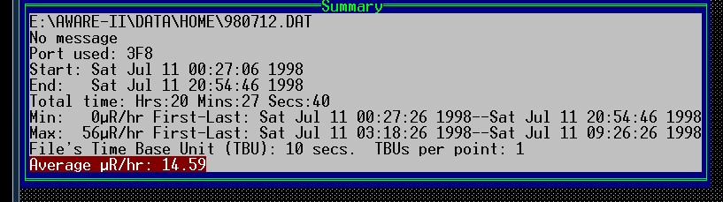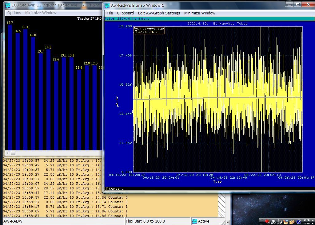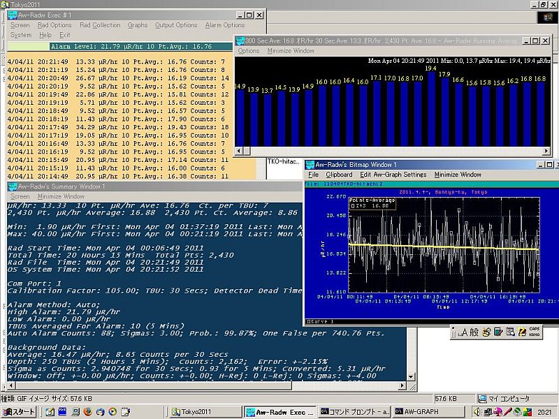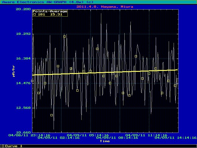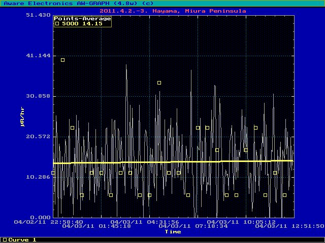 2011.4.2-3 (26 hours) in Hayama using Windows-version Aw-Sradw through serial-to-USB connector to notebook PC (old NEC VersaPro VA50H), with calibration (105.00 --> 210.00) indicated by Bryan J. Boardman at Aware Electronics:Summary graph of measument: 2011.4.2-4.3 Night-to-noon (14 hours) - Average 14.15µR/hr