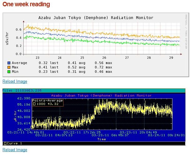 Denphone Tokyo Office Geiger Counter at Azabu Juban, Summary graph of measument 3.22-29 and 3.21-24 (By courtesy of Denphone).