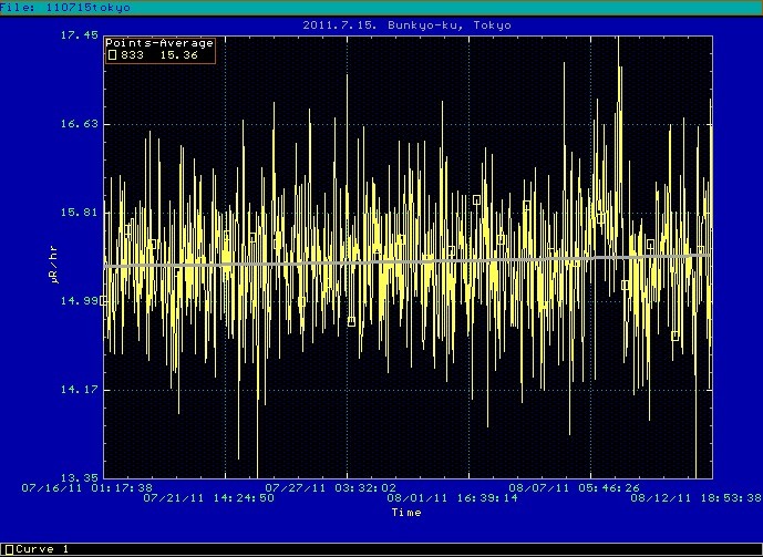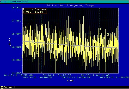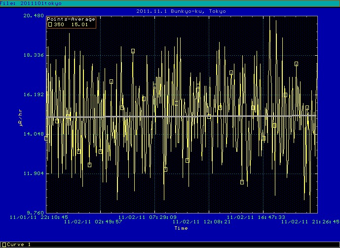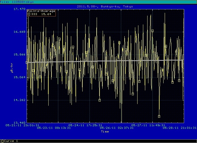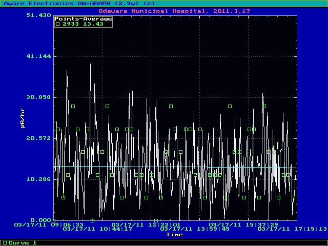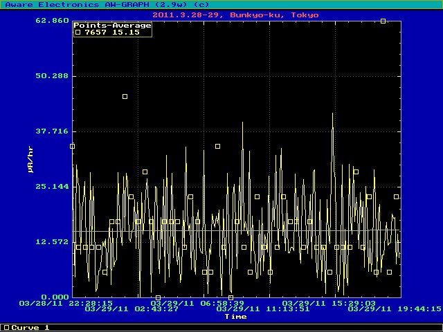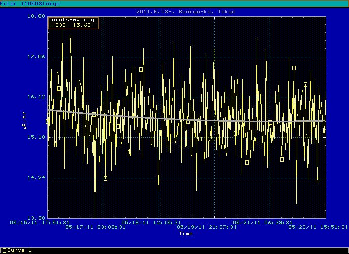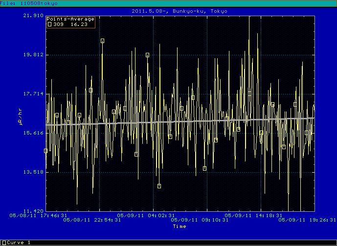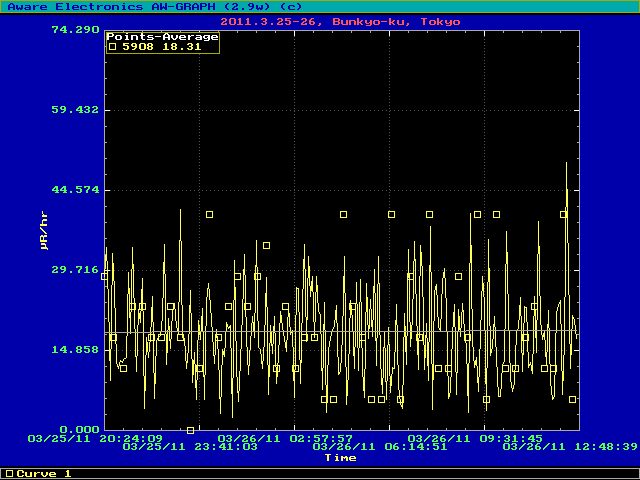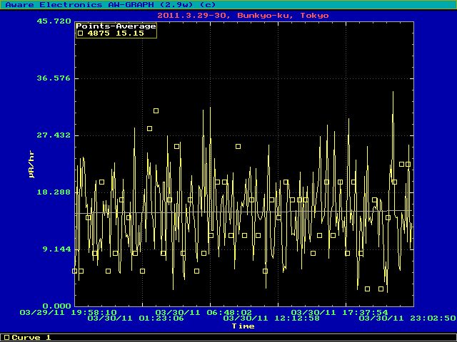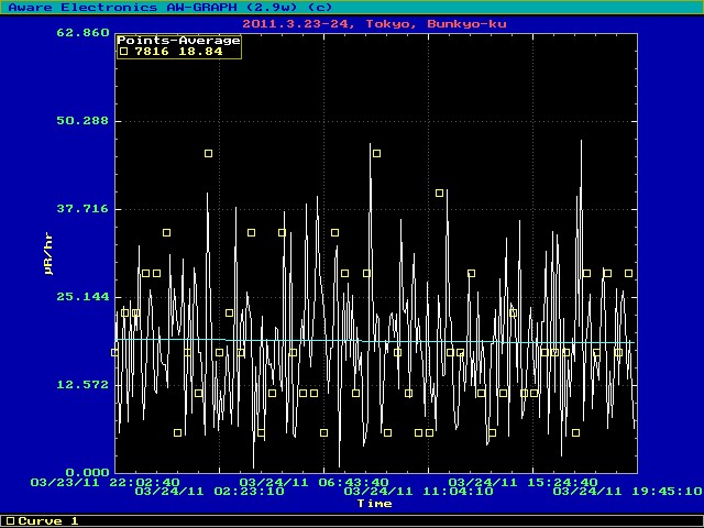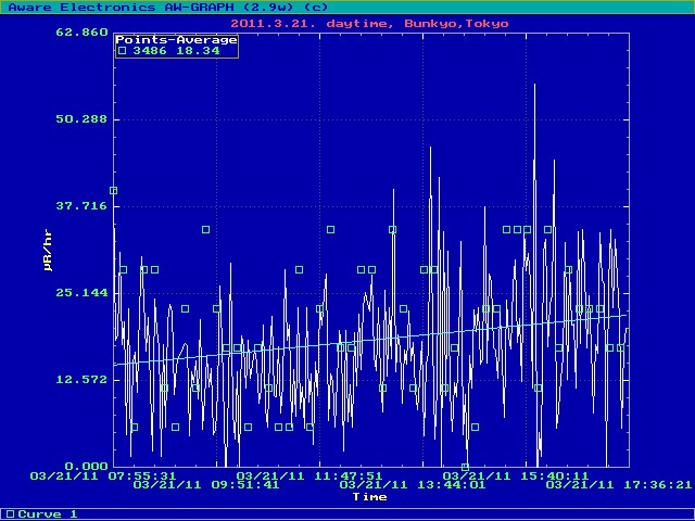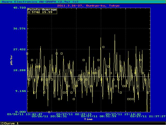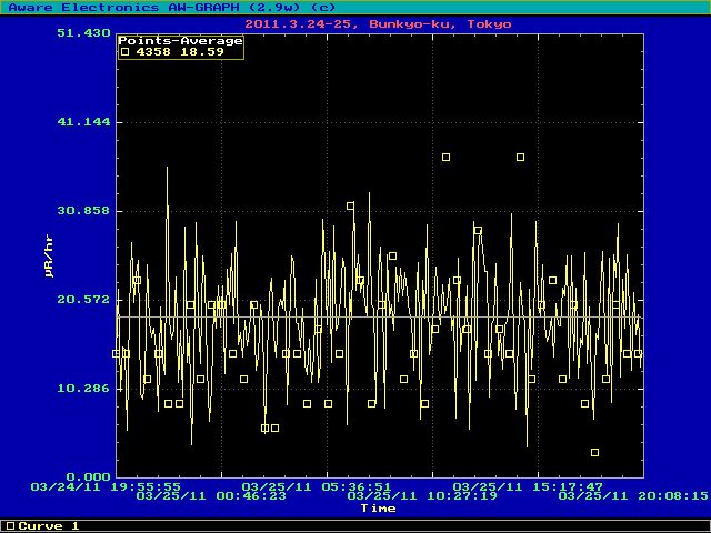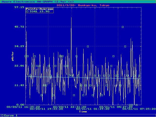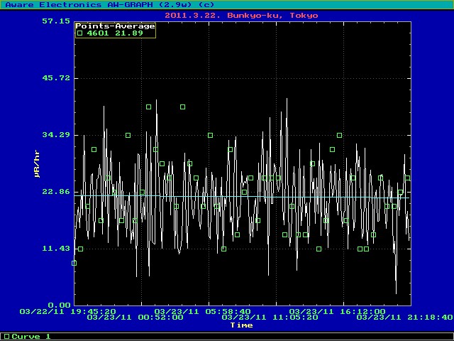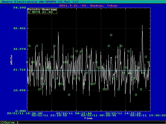 Summary graph of measument: 2011.3.20 overnight (15 hours) - Average 15.90µR/hr, already a bit increased but stationary Summary graph of measument: 2011.3.21 daytime (9 hours) - Average 18.34µR/hr, increasing in the rainy afternoon, with north-east wind (maximum 60-point-average value over 21µR/hr). Summary graph of measument: 2011.3.21-22 Night-to-night (24 hours) - Average 21.30µR/hr, closing at elevated-value, stationary, all-day rainy, with largely north-to-northeast wind. Summary graph of measument: 2011.3.22-23 Night-to-night (24 hours) - Average 21.89µR/hr, closing at elevated-value, stationary, all-day rainy, with largely north-to-northeast wind (maximum 60-point-average value over 23µR/hr). Summary graph of measument: 2011.3.23-24 Night-to-night (24 hours) - Average 18.84µR/hr, a bit decreased, all-day cloudy, with turbulant wind over Ibaraki Prefecture which is located between Fukushima and Tokyo Metropolitan Area.