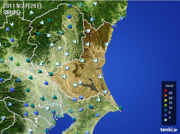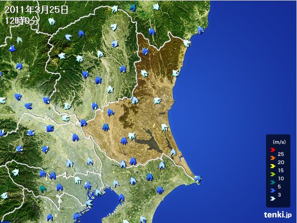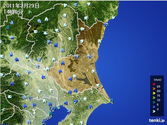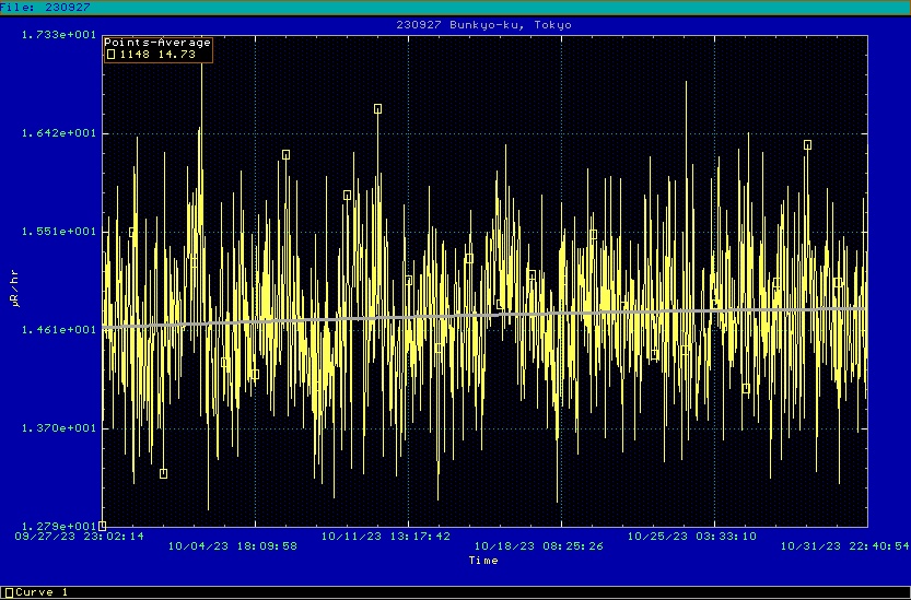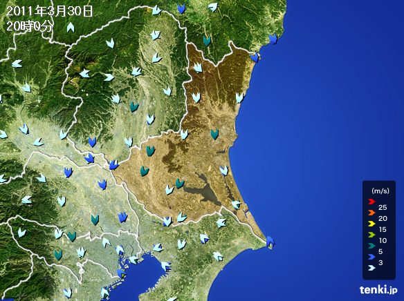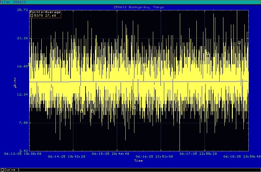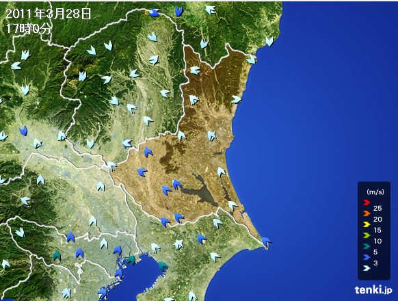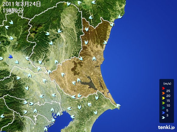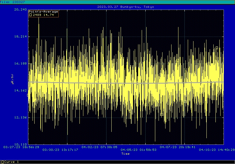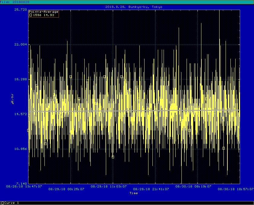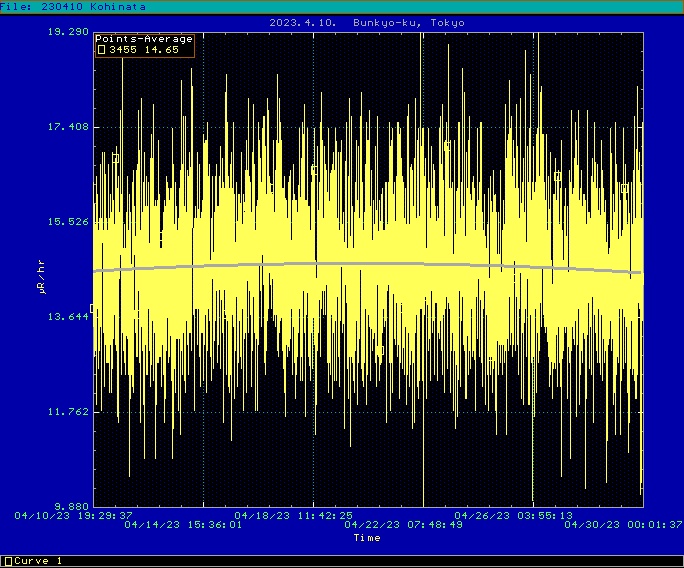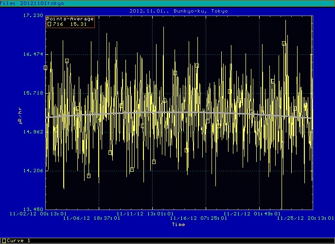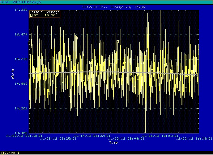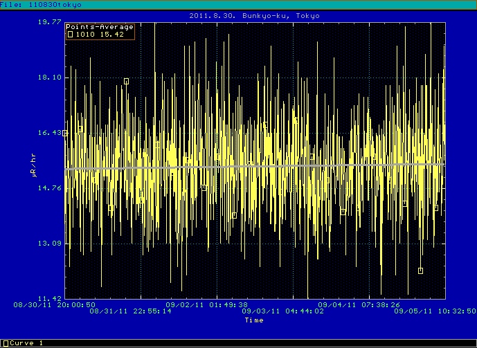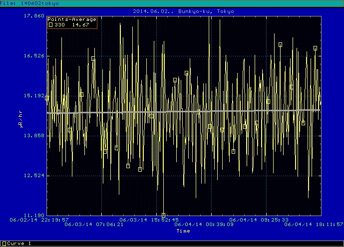 Summary graph of measument: 2011.3.20 overnight (15 hours) - Average 15.90µR/hr, already a bit increased but stationary Summary graph of measument: 2011.3.21 daytime (9 hours) - Average 18.34µR/hr, increasing in the rainy afternoon, with north-east wind (maximum 60-point-average value over 21µR/hr). Summary graph of measument: 2011.3.21-22 Night-to-night (24 hours) - Average 21.30µR/hr, closing at elevated-value, stationary, all-day rainy, with largely north-to-northeast wind. Summary graph of measument: 2011.3.22-23 Night-to-night (24 hours) - Average 21.89µR/hr, closing at elevated-value, stationary, all-day rainy, with largely north-to-northeast wind (maximum 60-point-average value over 23µR/hr). Summary graph of measument: 2011.3.23-24 Night-to-night (24 hours) - Average 18.84µR/hr, a bit decreased, all-day cloudy, with turbulant wind over Ibaraki Prefecture which is located between Fukushima and Tokyo Metropolitan Area.