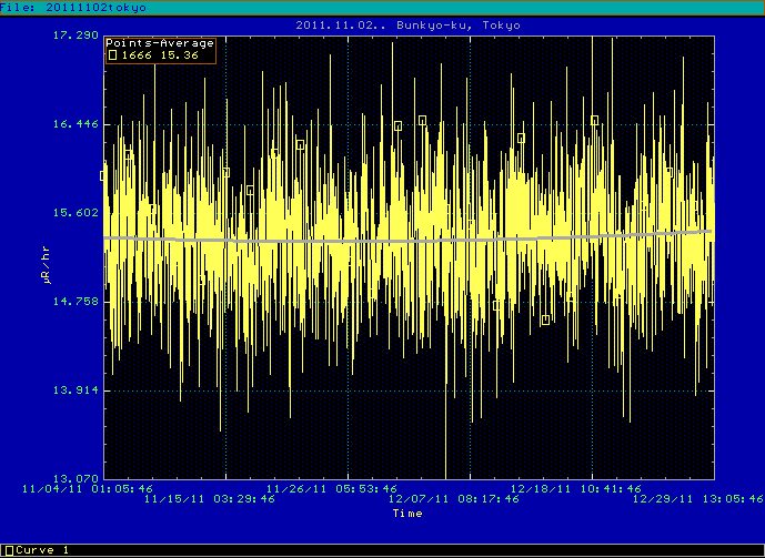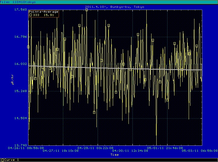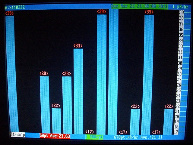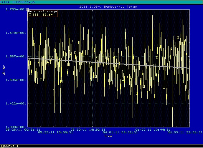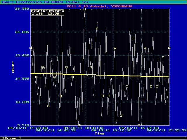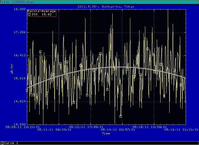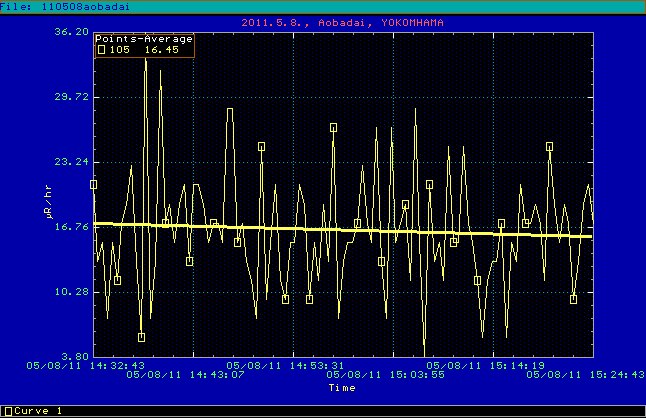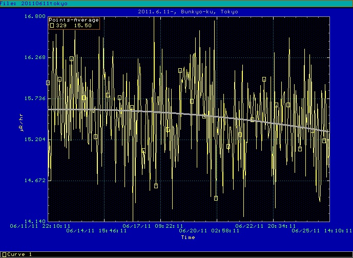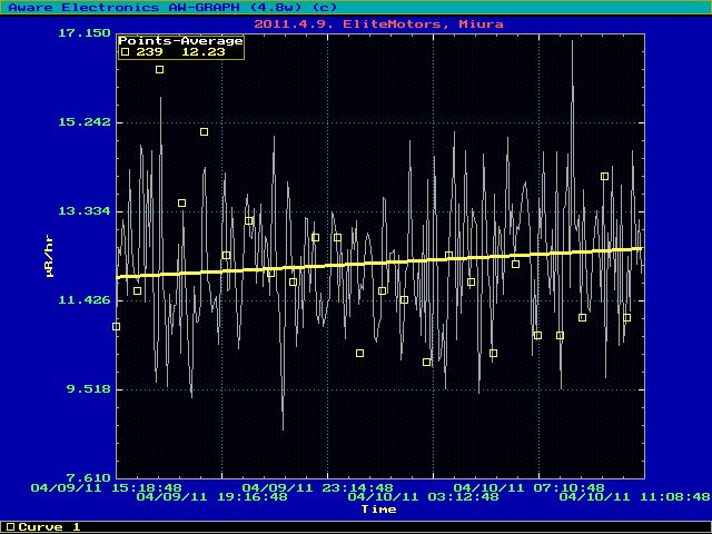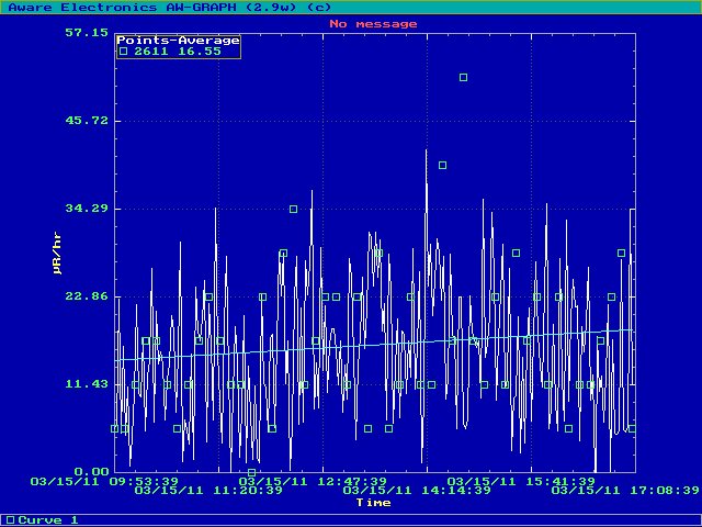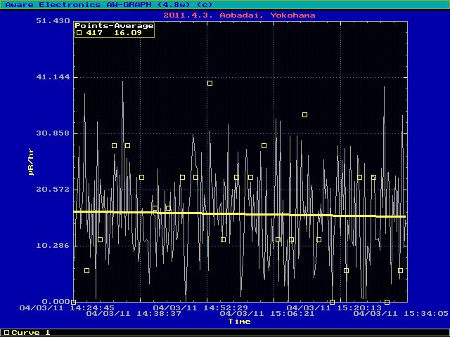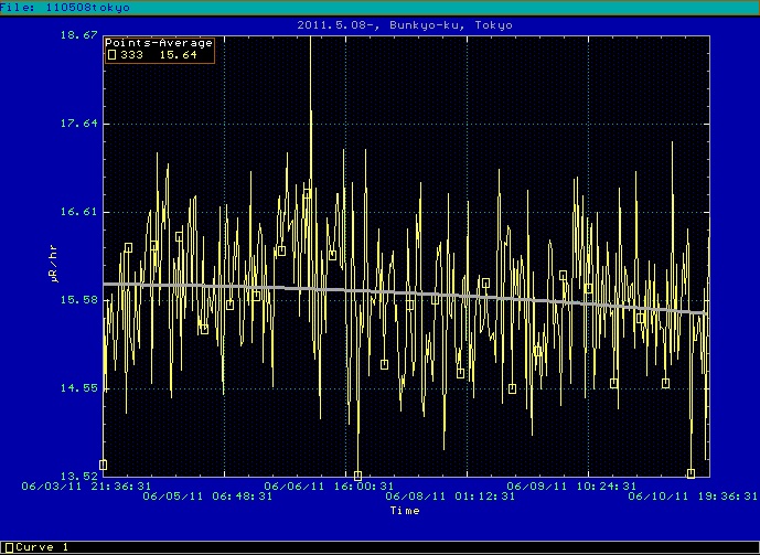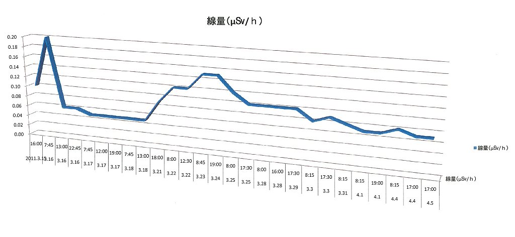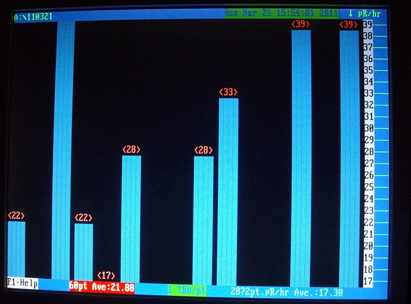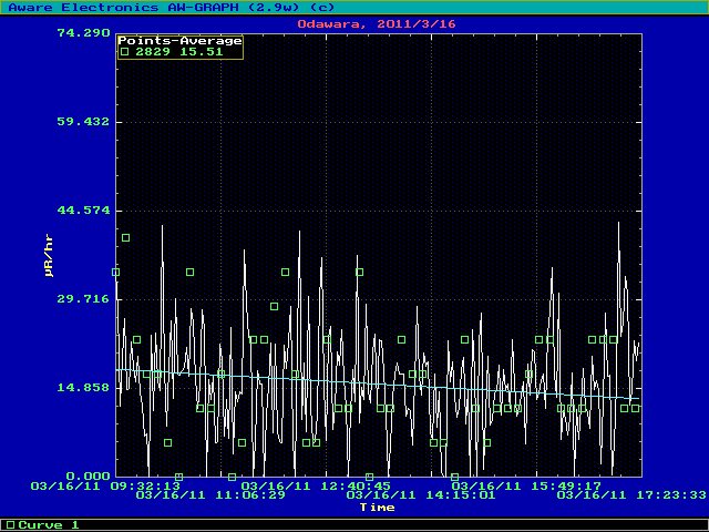 Click here to enlargeSummary graph of measument: 2011.3.15 daytime - Average 16.55µR/hr, increasing Summary graph of measument: 2011.3.16 daytime - Average 15.51µR/hr, decreasing, apparently after reaching plateau. Summary graph of measument: 2011.3.17 daytime - Average 13.43µR/hr, stationary Summary graph of measument: 2011.3.18 daytime - Average 13.11µR/hr, increasing "Apparently leveling off to 13+alpha µR/hr, back to the normal level + circa 10%"
