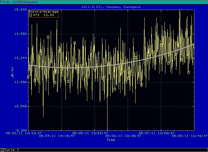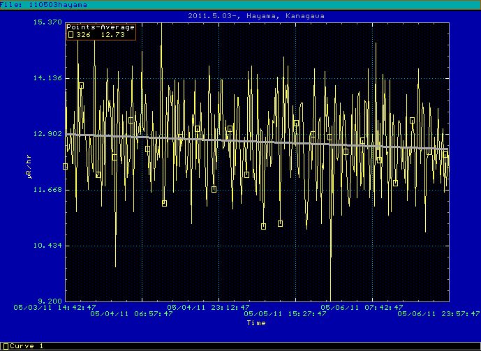 My second country house in Hayama located on the south coast of Miura Peninsula, which is two-by-four wooden construction (Mitsui Home), is located 260 km south west to Fukushima Nuclear facility.was observed (see next graph, baseline is drifted upward). Although this is not significant for biological implication at all (microscopic change, circa 1 µR/hr), it remains academically interesting. My guess is that it is due to some artificial procedure, e.g., vent, etc. The most likely cause is the opening of the double-entry doors at the troubled No.1 reactor, which connects it to the adjacent turbine building, at around 8PM on Sunday (May 8), according to the news report of Tokyo Electric Power Co.'s statement. By opening the door, cooler air is ushered in from turbine building to the reactor building, then some radioactive material in the upper layer of air would be released from the ceiling severely damaged by hydrogen explosion to the atmosphere, they predicted (premeditated risk). However, timing (May 8 Sunday night) is a bit out of alignment from the beginning of increase of radioactivity in my measurement (May 6 Friday-to-May 7 Saturday midnight).