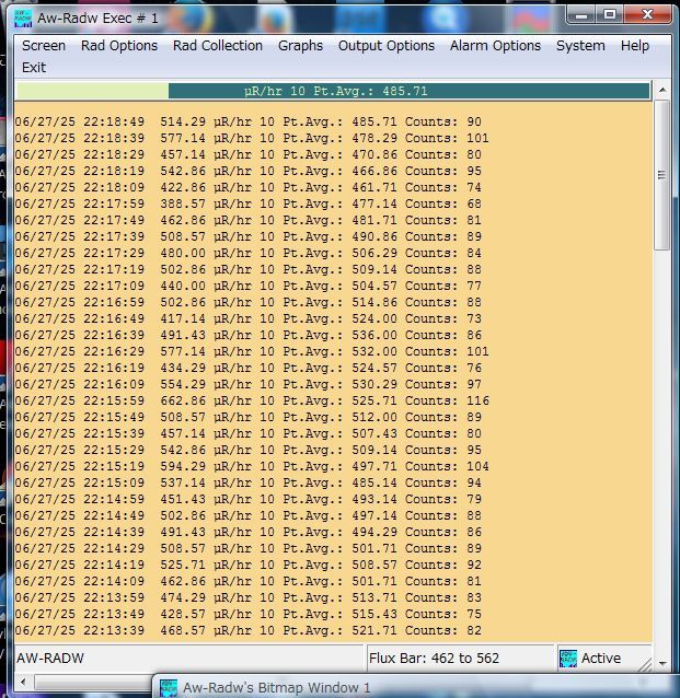 Realtime background radiation monitor in Clarkdale, Arizona, USA by Del Winiecki, who too is using the same setting, i.e., RM-60 with Aw-sradw and Aw-graph.