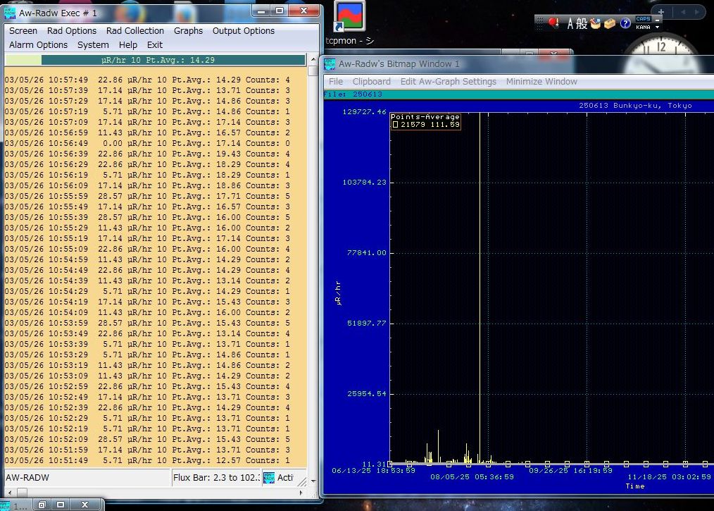 2011.4.3 and 10 (1 hour) in the care home of my mother Miyoko in Aobadai of Yokohama City using Windows-version Aw-Sradw through serial-to-USB connector to notebook PC (old NEC VersaPro VA50H) with calibration indicated by Bryan J. Boardman at Aware Electronics: