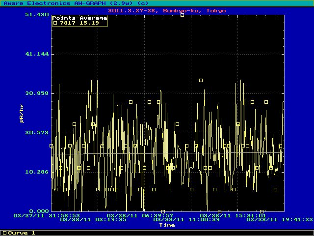 Summary graph of measument: 2011.3.27-28 Night-to-night (24 hours) - Average 15.19µR/hr, decreasing, clear sky, with largely southeast wind over Ibaraki Prefecture which is located between Fukushima and Tokyo Metropolitan Area.