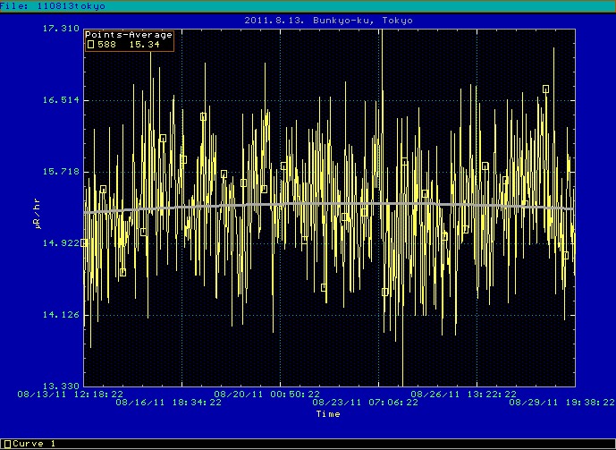 Summary graph of measument: 2011.3.29-30 Night-to-night (27 hours) - Average 15.15µR/hr, stationary, clear sky, with largely north wind over Ibaraki Prefecture which is located between Fukushima and Tokyo Metropolitan Area.