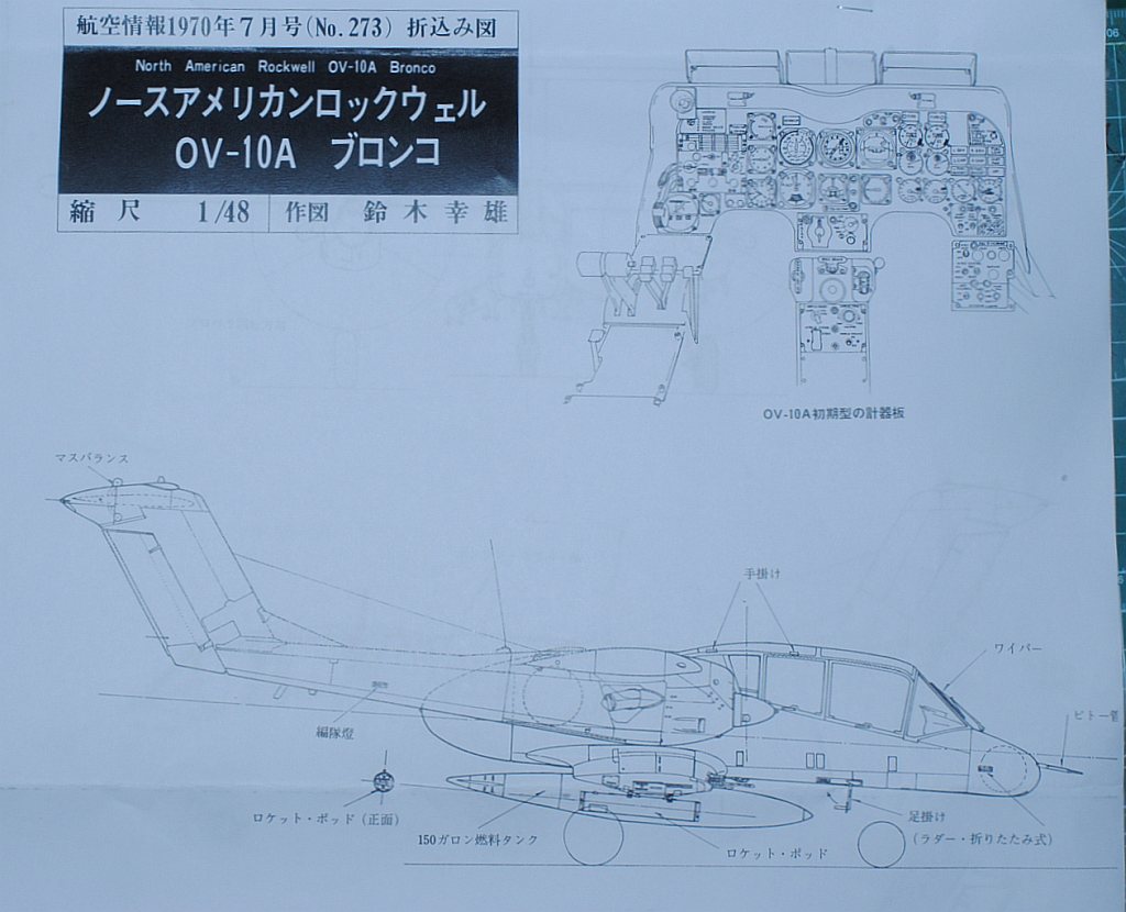 2013. 9.6.-7. Exact three-view 1/48 drawing of OV-10A by Yachio Suzuki (Aireview July 1970, Japanese journal, Reference #1) was unearthed from the library at Hayama retreat. We are long-term regular subscriber to this journal, and have saved them. My late father Tatsuo was originally aircraft desiginer (engineer, planner) and I am airplane enthusiast (Actually, hoped to become that speciality before changing my mind to medicine.
