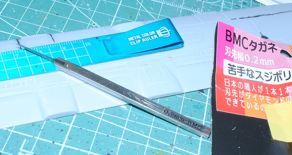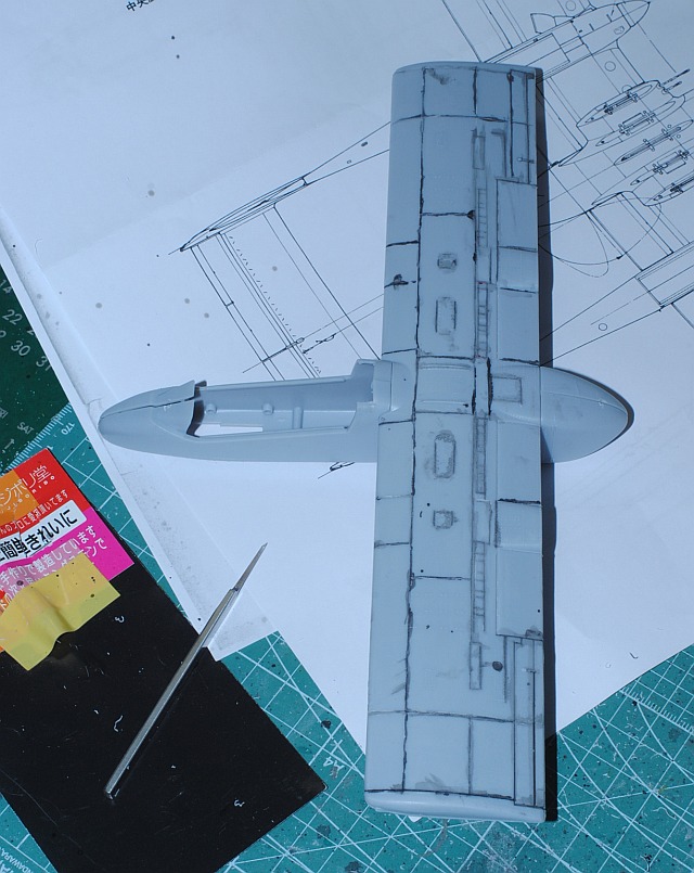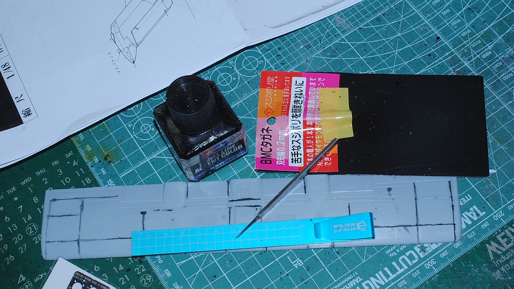 Then, I dig parting lines on the surface, using sharp scratch gauge (width 0.2 mm, made from tungsten), followed by Tamiya panel line accent paint - temporary assembly.