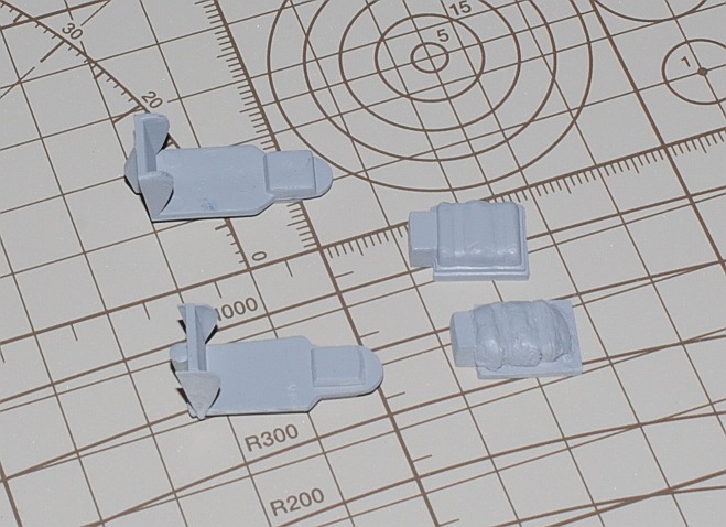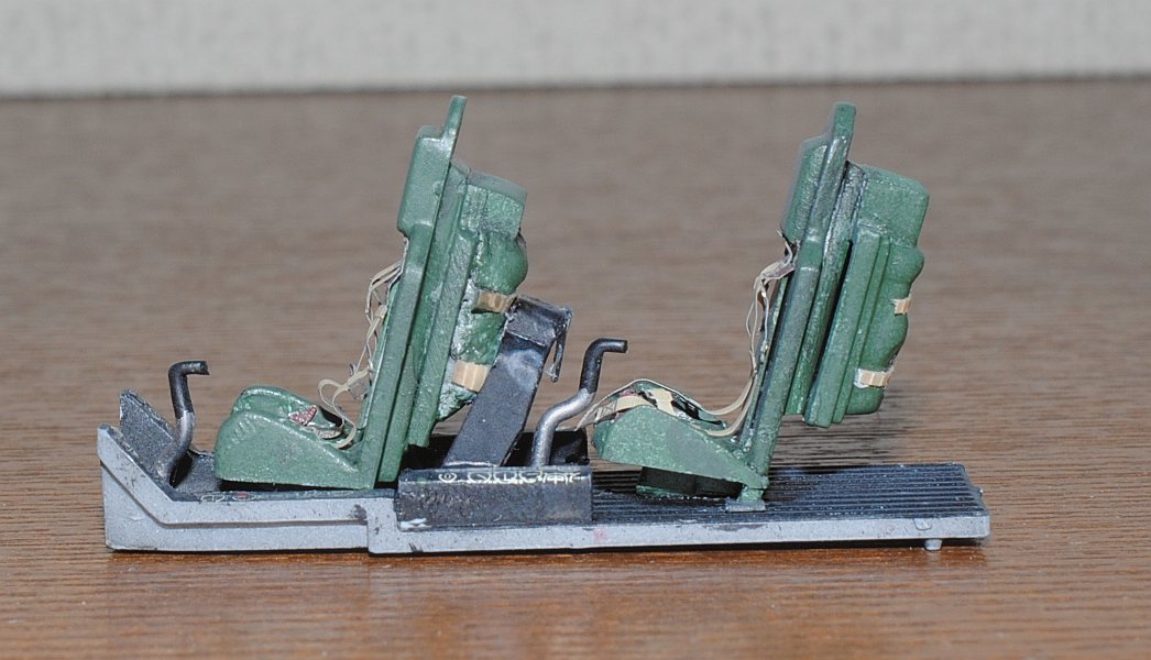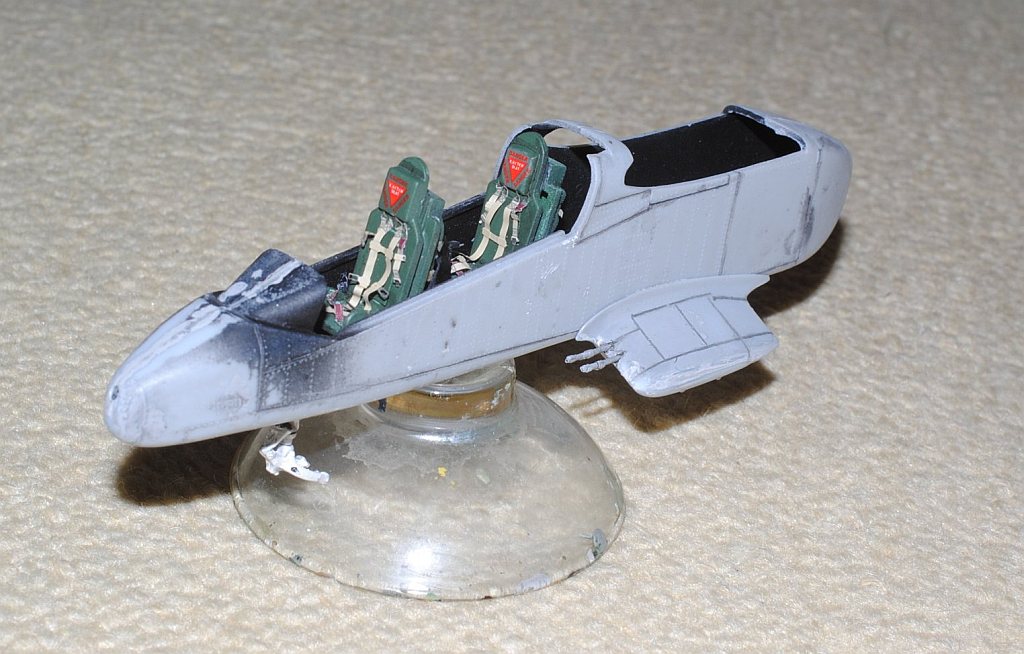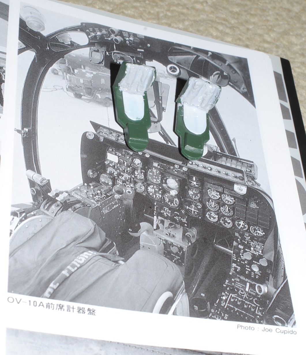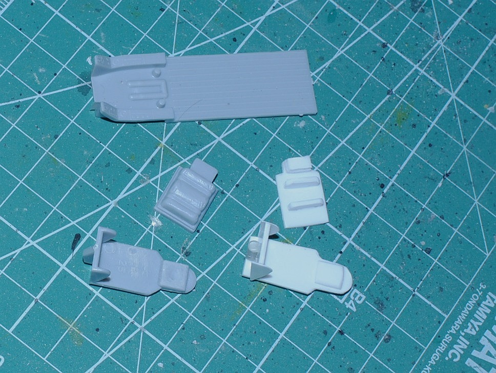 2013. 9.14-16. The interior of the cockpit of this kit is too simple and not supplied with details. Especially astonishing is no copilot seat is included! Actually both seats are ejection-type. So I make copilot seat from scratch, using 1.2 mm-thick and more thin plastic sheets. Photo-1: White seat in the right is newly built one, Photo-2: After applying putty to the back structure of the seat (lower right, parachute?), Tamiya surface primer (gray) is sprayed (lower two units are scratch-built),
