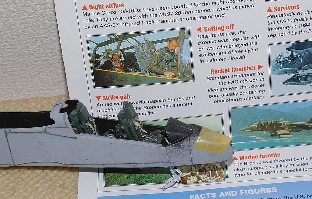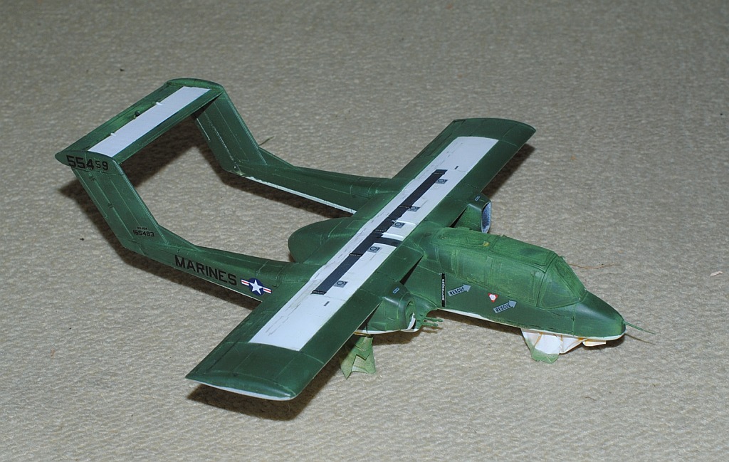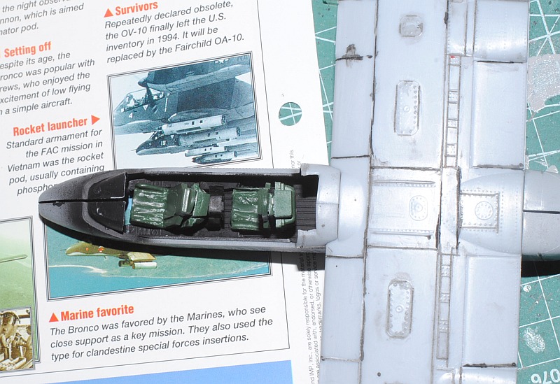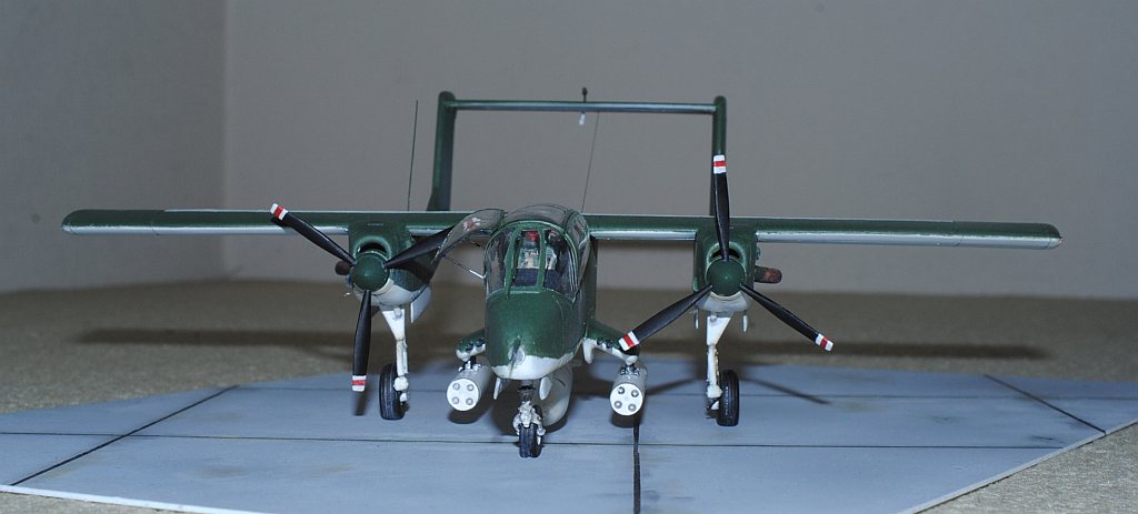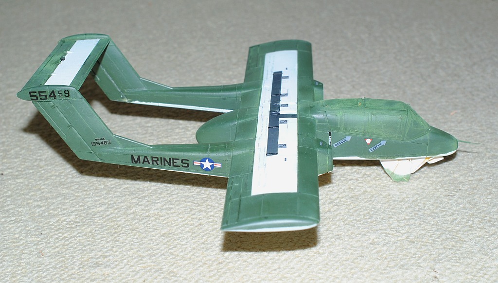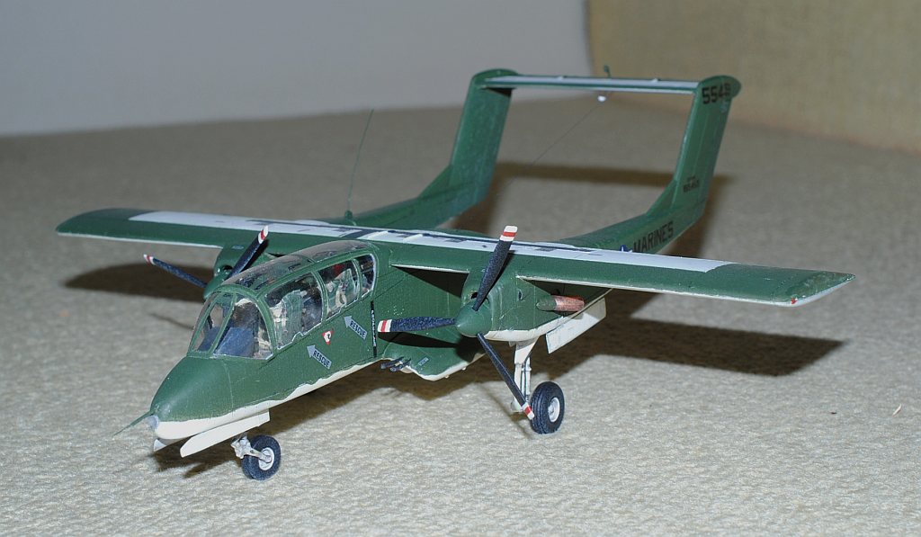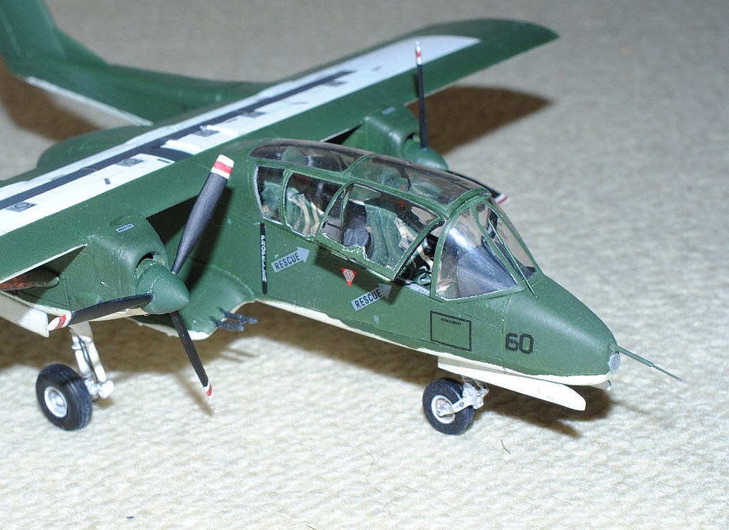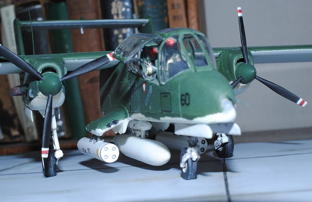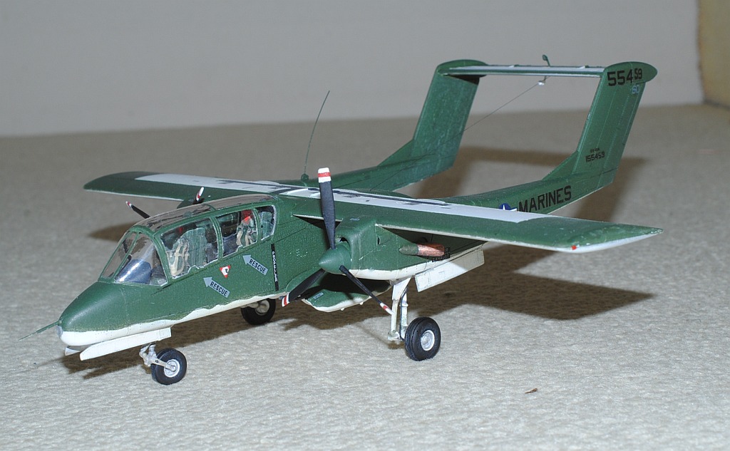 [Referenced Image] My model is from VMO-6, though, this image is very representative of their brave mission, I suppose. During Operation Talor Common in 1968, OV-10A of VMO-2 was hit and landed to An Hoa Airfield, circa 35 km southwest to Da Nang Base. The battle damage was assessed by pilot Major (or Captain) Calvin A. Lloyd (spell?) and observer Ensign Sharon C. Cartney (spell?). Under the sponson, LAU-32/A 2.75 inch rocket pods are installed. Very informative image from Famous Aircracts of the World, vol.45, OV-10 "Bronco", Kokufan, Bunrindo, Tokyo, Japan(2001/02, ISBN-13: 978-4893190420).