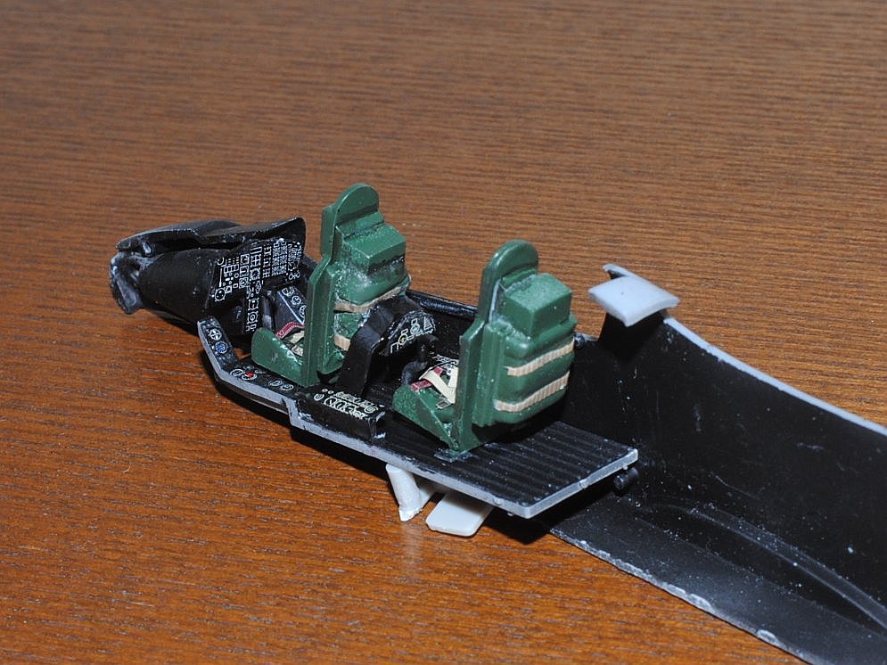 2013. 9.27-28. Firstly the intrumental panel for copilot is made with thin plastic plate, and painted in black, ditto viewed with two seats in position, ditto view from the back, temporarily assembled with fuselage, ditto temporarily assembled with fuselage.