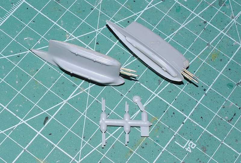 2014.01.17-18. 150-gallon drop-tank (type Aero 1C) is scratch-built using excess parts (anterior and posterior half, and tail fin separately), and rocket pods (launcher, LAU-32/A 2.75 inch rocket pods) are transfered from Fujimi 1/48 F-4 Skyhawk, which I modelled circa 40 years ago. Ventral pylon for tank is from Tamiya 1/48 ammunition package for US jets - Photo-1, Photo-2, Photo-3, Photo-4, Photo-5 (under surface), Photo-6 (left anterior angle), Photo-7 (enlarged view of ammunition and drop-tank).
