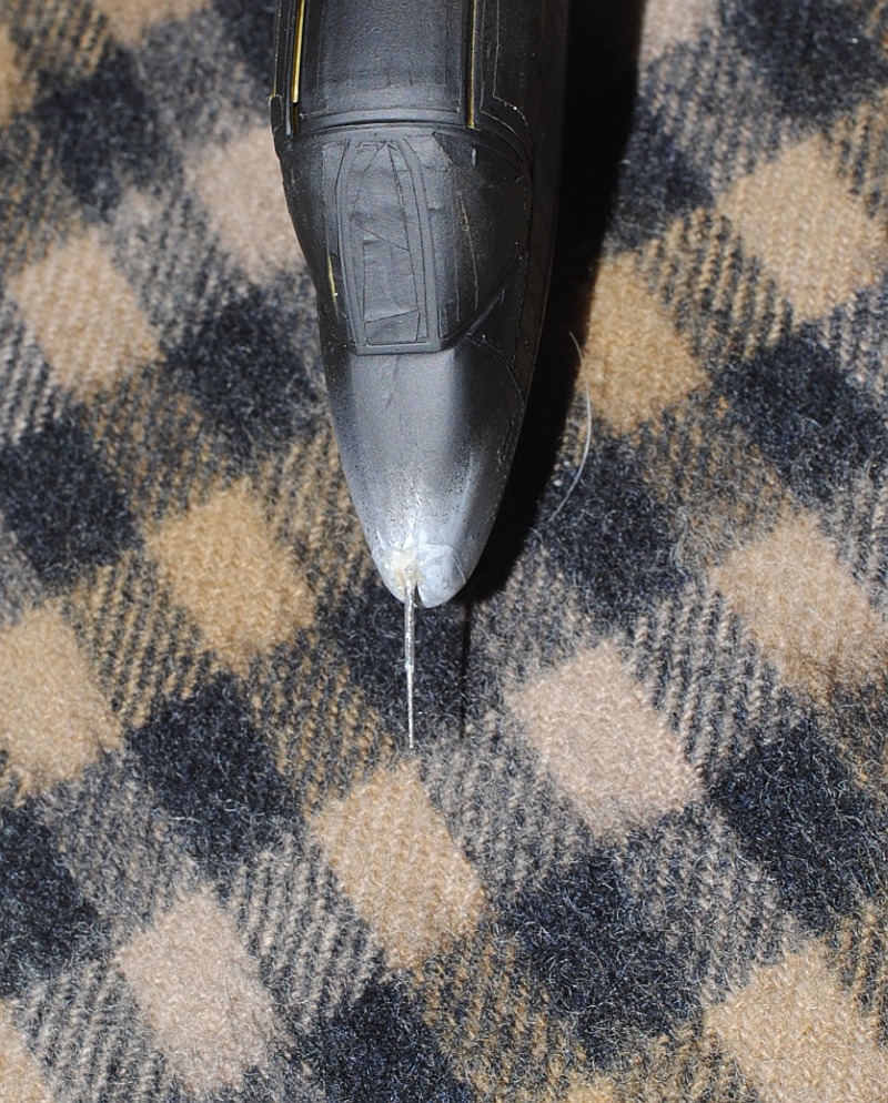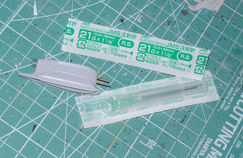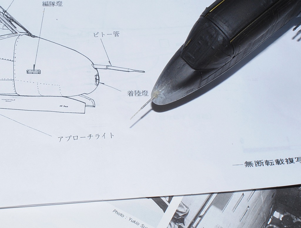 2013. 11.08-09. Pitot tube was made scratch using injection needle (21G) and 0.3mm brass line, Photo-1, Photo-2, then undersurface of the fuselage and wings is sprayed mat white (surface primer) in the box of Amazon, Photo-3.