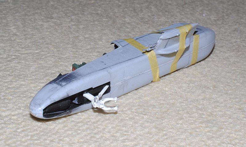 2013. 11.02. After polishing clear parts of the canopy with Tamiya compound (one of three rank, For Finish), clear portions are masked with tape and glued carefully, ditto, close-up view, then flat black for internal aspect of the window frames is sprayed. Later, on this black, deep green will be sprayed for external surface color.