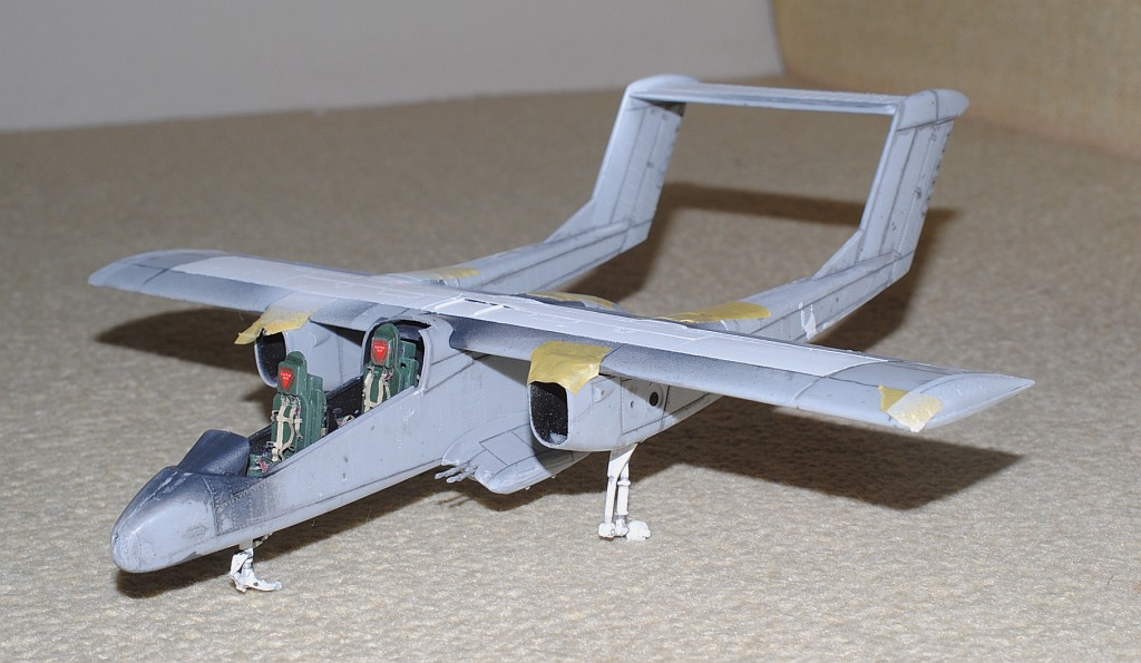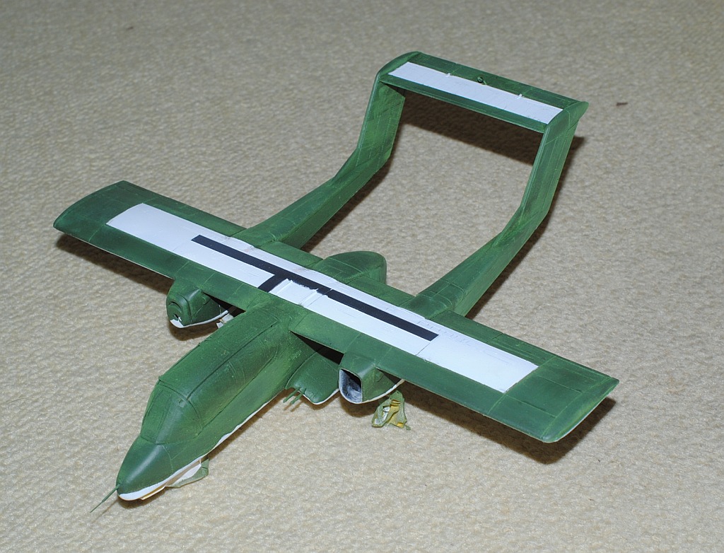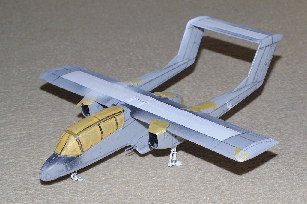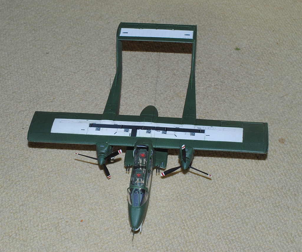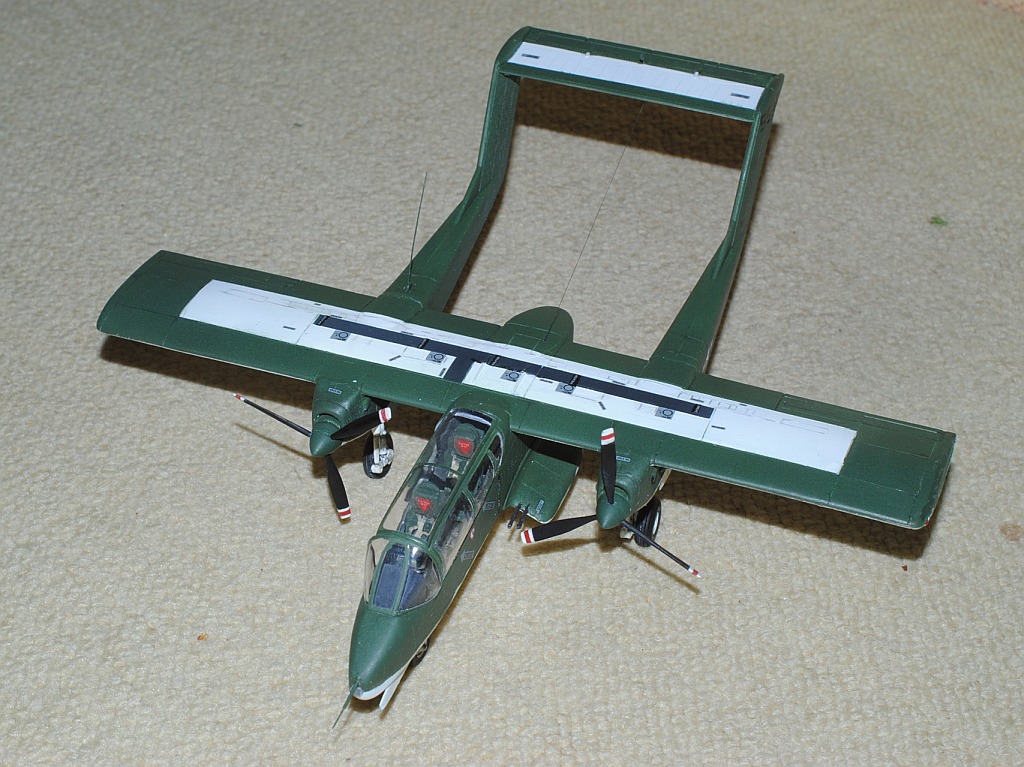 2013. 10.25-26. Upper surface of the main wing and tailplane of OV-10 was painted white in various patterns, in order to be identified Friend from the above-flying friendly planes during Viet Nam war. After masking and spraying white in rectangular pattern, temporary assembly is done using tapes -