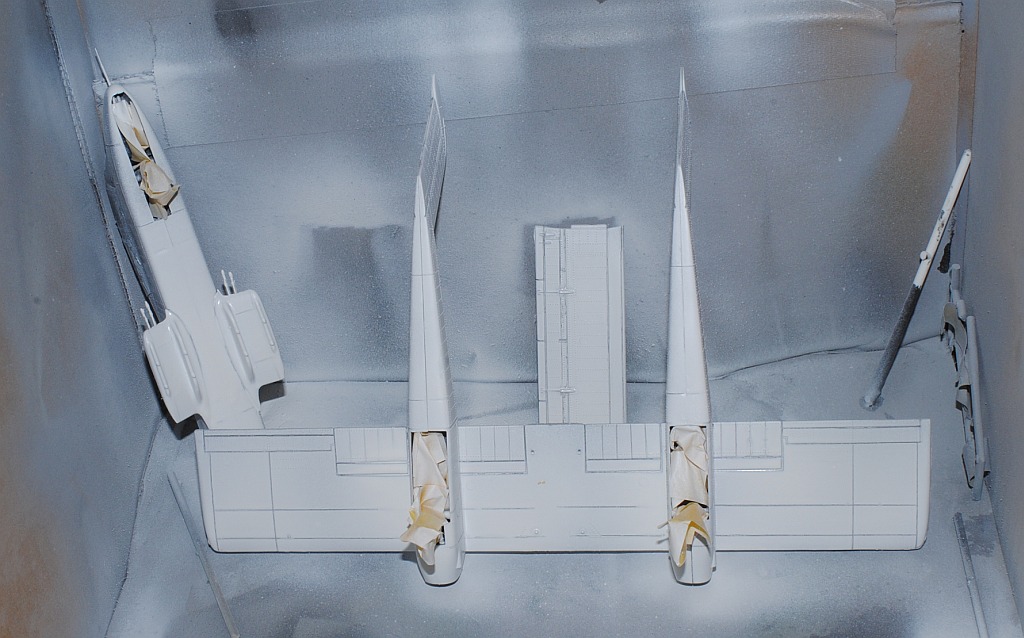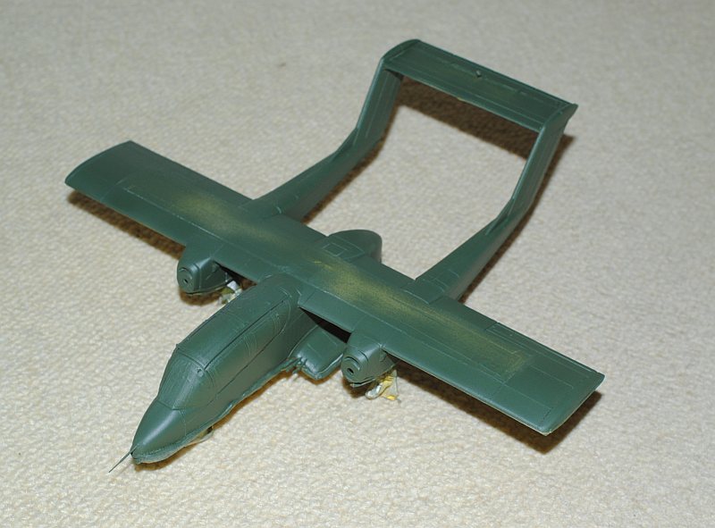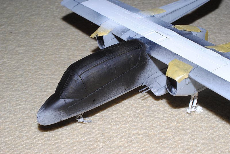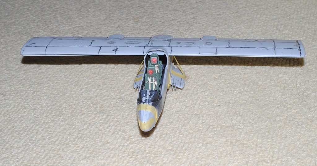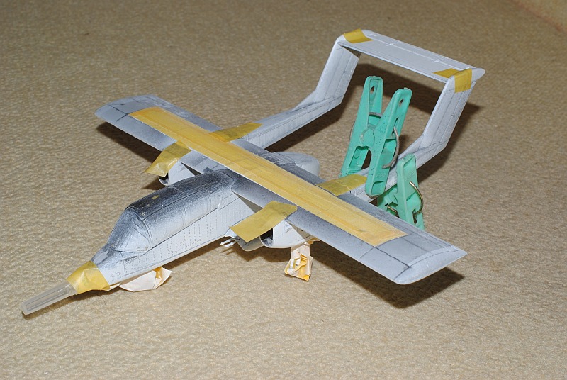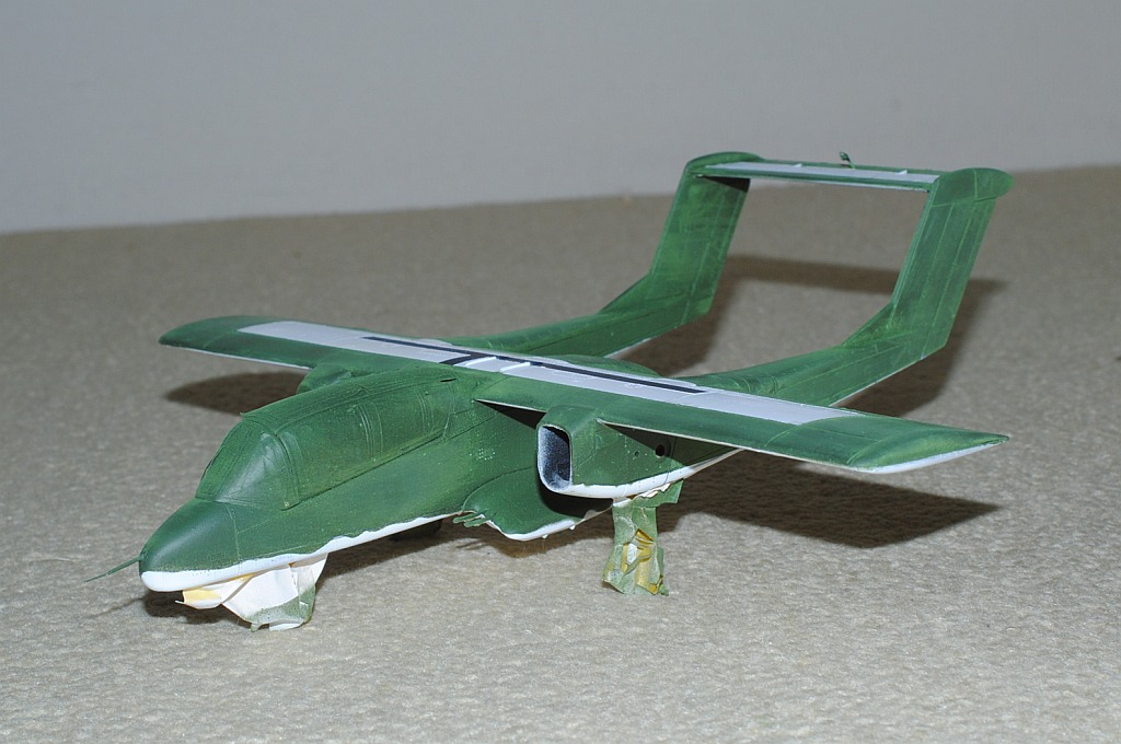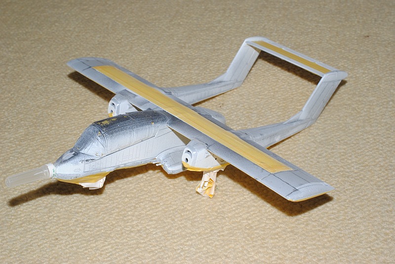 2013. 10.25-26. Upper surface of the main wing and tailplane of OV-10 was painted white in various patterns, in order to be identified Friend from the above-flying friendly planes during Viet Nam war. After masking and spraying white in rectangular pattern, temporary assembly is done using tapes -