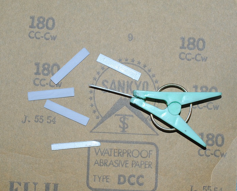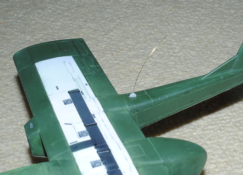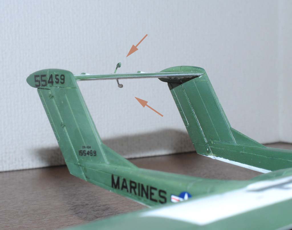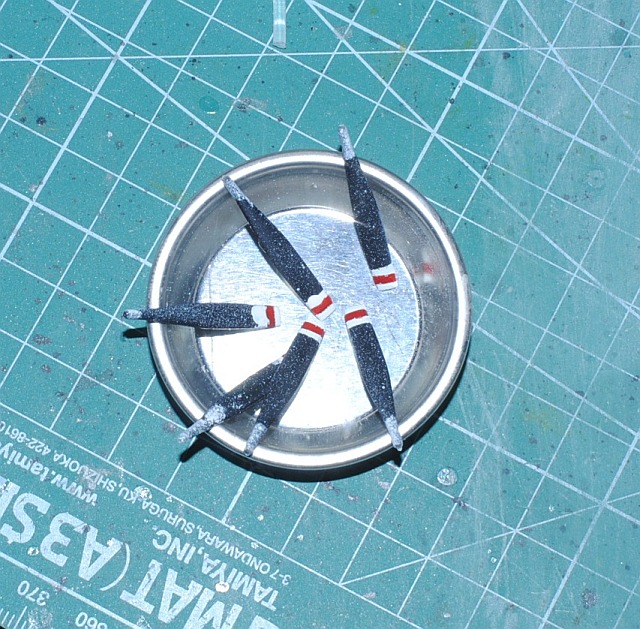 2013. 12.14. Landing light (USAF 27TASS 68-3795 in 1989-1991 "Fast In - Last Out") is not included in the original kit , so I made with clear plastic branch. Maybe too much protuberant, I will adjust it later - Photo-1. Mass balance weights on the elevator are scratch-built de novo with aluminium wire and putty, since the original parts is too fat and dull - Photo-2. Tip of propeller blades are painted white-red-white stripe in the Marine version , while yellow(external)-white(inner) in the USAF version. I am making Marine version (actually, this is the target for my model, Marine Bronco 55459 in action near Da-nang Base in Viet Nam, probably VMO-2 in 1968-). Firstly I painted red, Photo-3, then painted white stripe, Photo-4. After the tip stripe portion is masked, main portion is painted black - Photo-5.