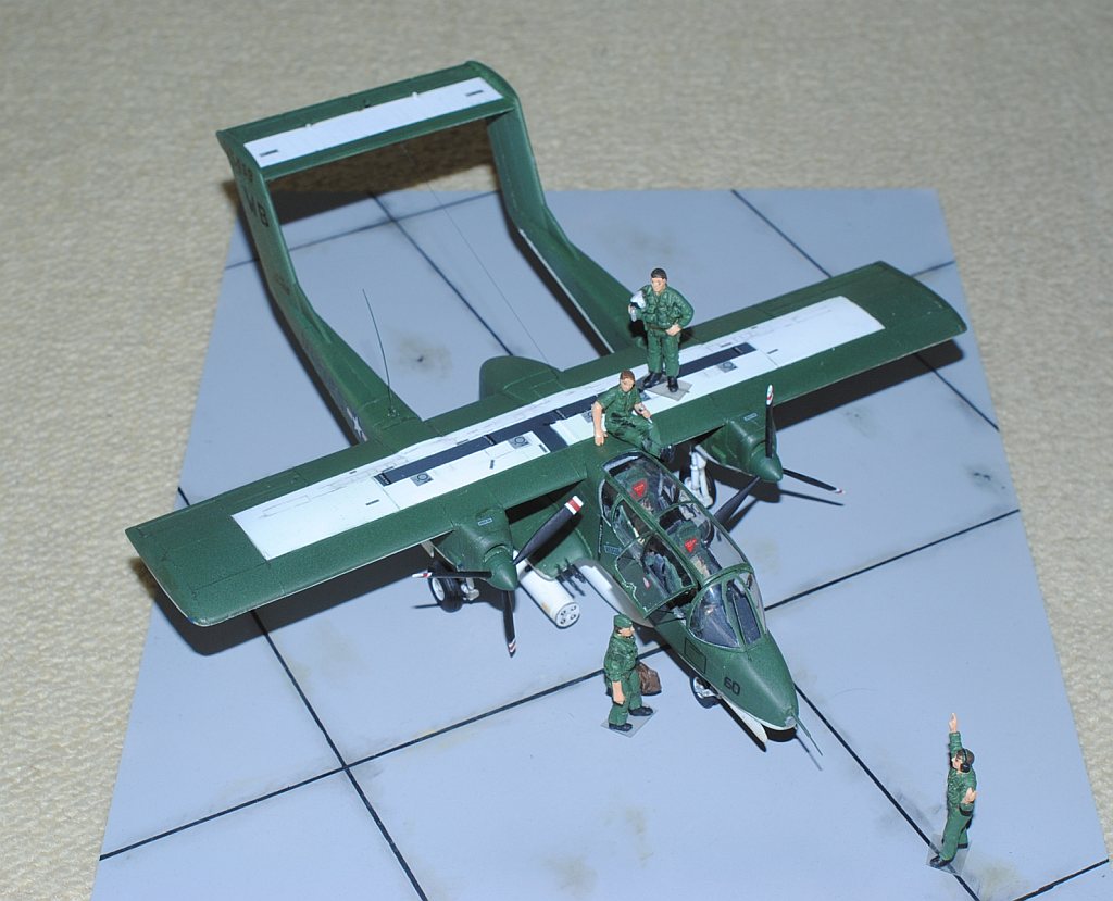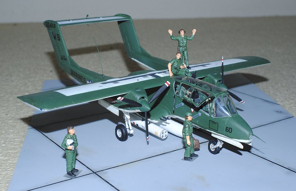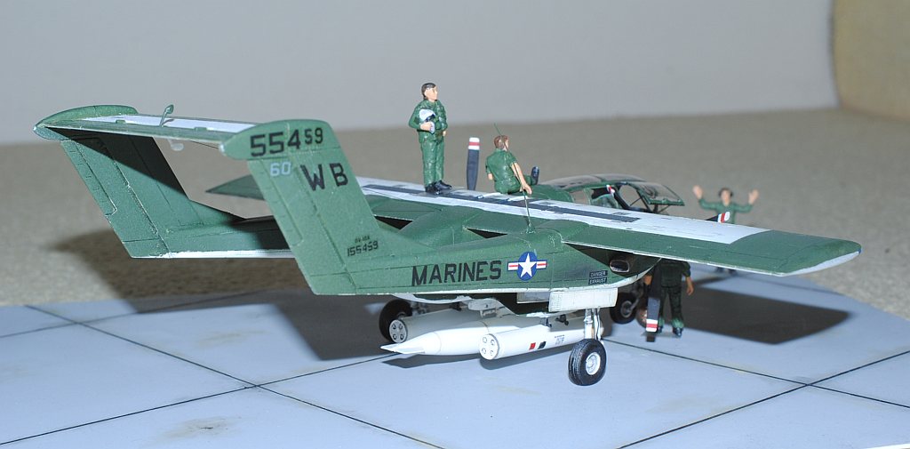 2014.01.24-25. The figures of the crew and ground-based personnel are painted, using Hasegawa's 1/48 U.S. Pilots/ Ground Crew Set:B, with reference to the image from the reference No. 3 (see bellow) - Serial #55413 of VMO-2. My model is from VMO-6, though, this image is very representative of their brave mission, I suppose. During Operation Talor Common in 1968, OV-10A of VMO-2 was hit and landed to An Hoa Airfield, circa 35 km southwest to Da Nang Base. The battle damage was assessed by pilot Major (or Captain) Calvin A. Lloyd (spell?) and observer Ensign Sharon C. Cartney (spell?). Under the sponson, LAU-32/A 2.75 inch rocket pods are installed. Very informative image for the current project. The diorama is completed - Serial #55459 of WB-60, VMO-6, Photo-1 (right anterior view), Photo-2 (Upper right anterior view),