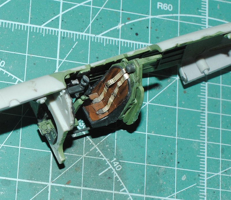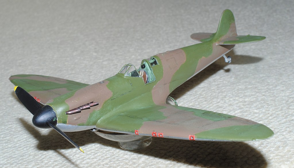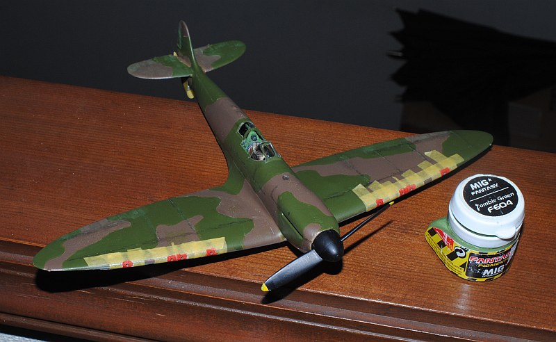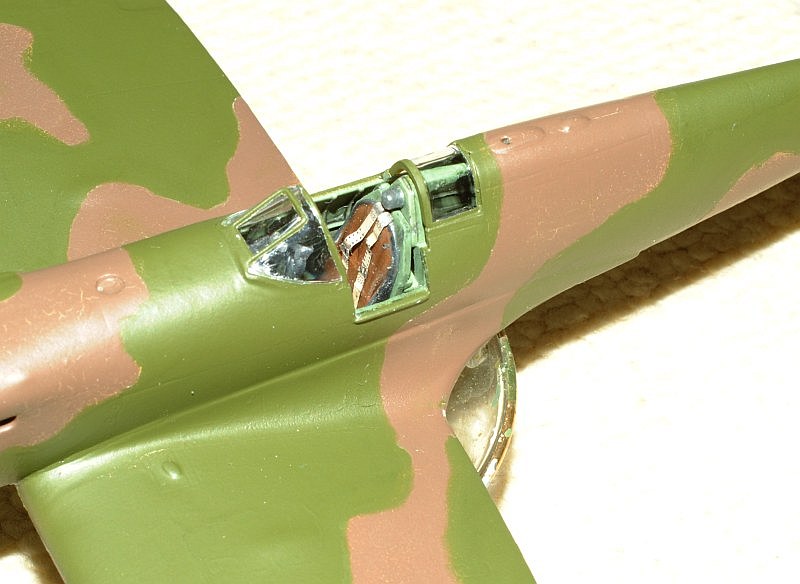 2013.2.16-17. Upper surface dark green (iMr Hobby) is sprayed after parting with Blu-Tack and paper. I in some trepidation detached masking tapes of the wind shield glasses, and minimal touch-painting wth dark green was added. The other view angle, and close-up view of cockpit.