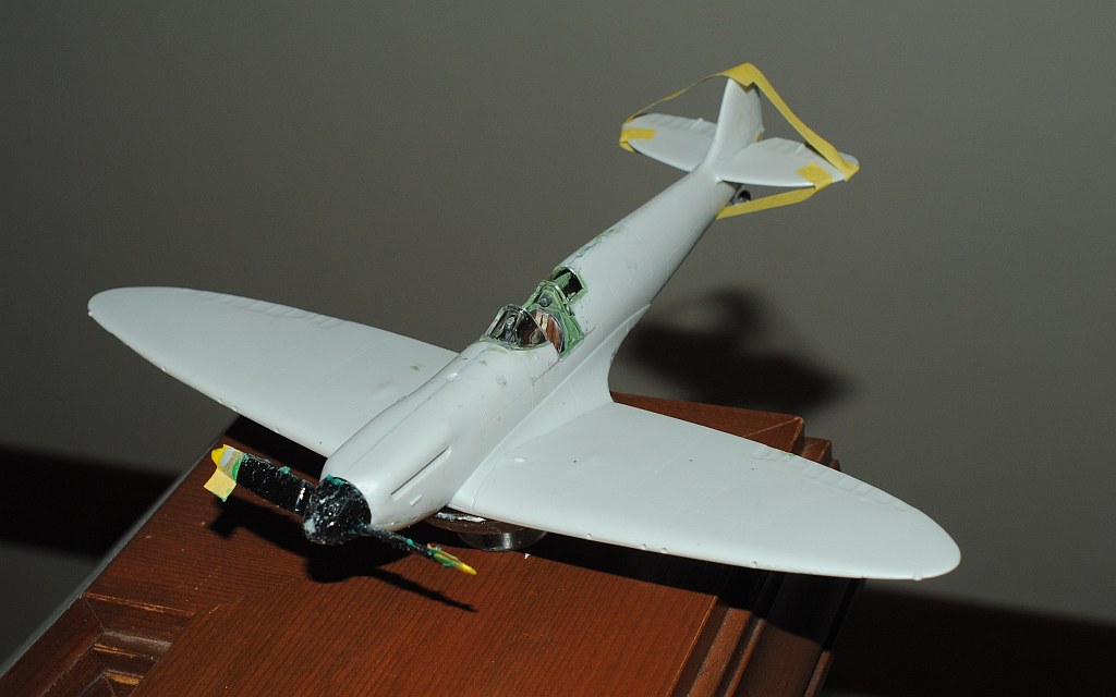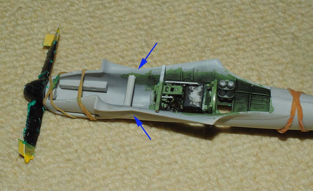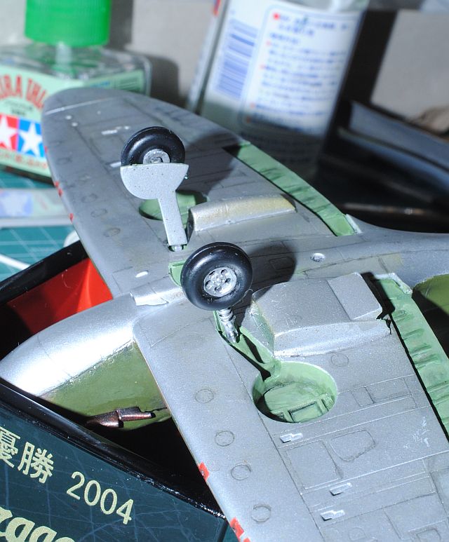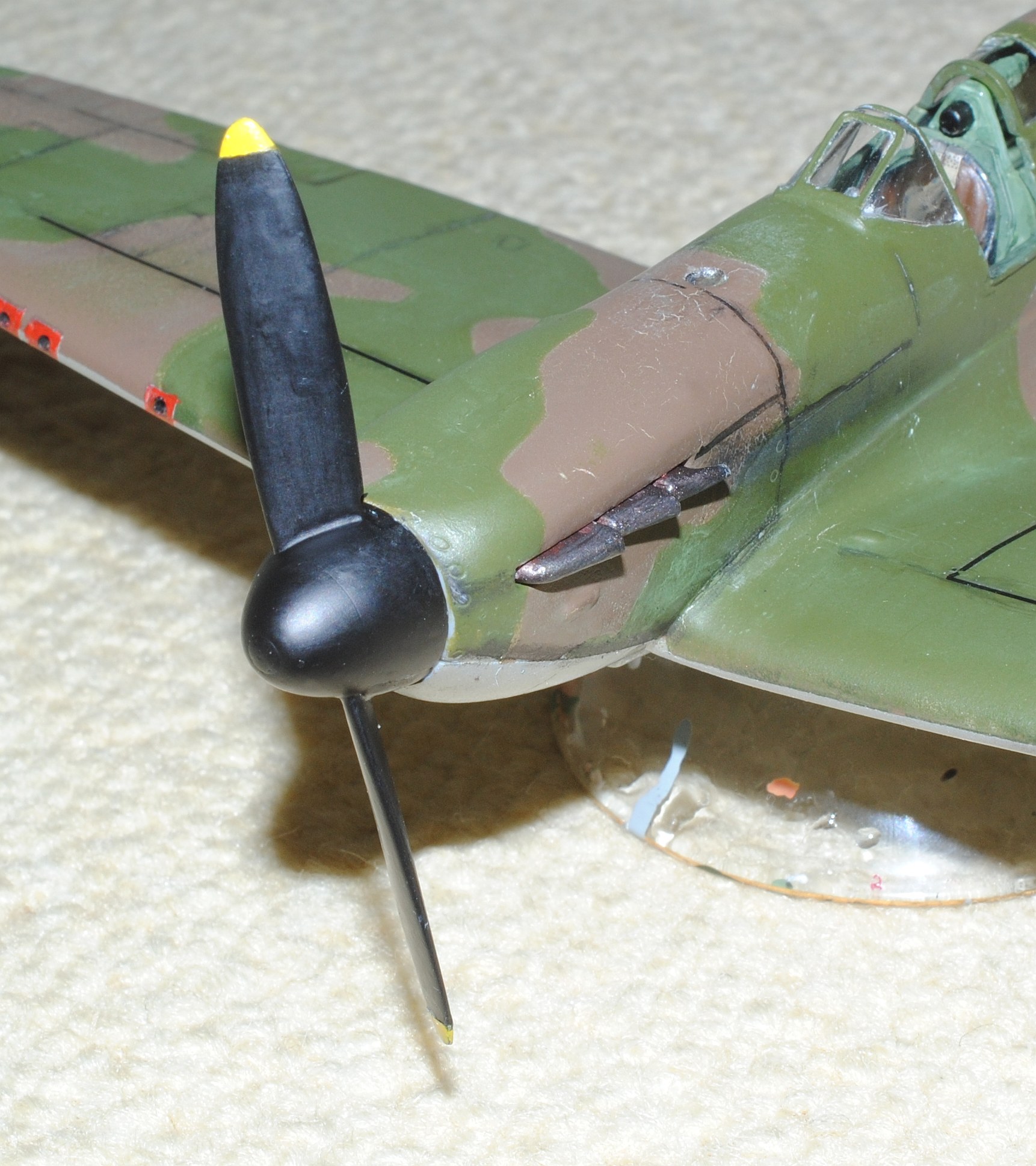 2012.22-24. Main wing and tail horizontal wing is glued with fuselage, paying attension to consistent dihedral angles of both the wings (tail wing is of course horizontal in straight line). I used tape to fix the proper angle. Residual gaps were filled with Tamiya Liquid Surface Primer, and two-blade propeller and spinner is masked with sol after painted in black. Frontal edges of underwing air inlets (radiator) are sanded to be sharpened or rounded before glued.