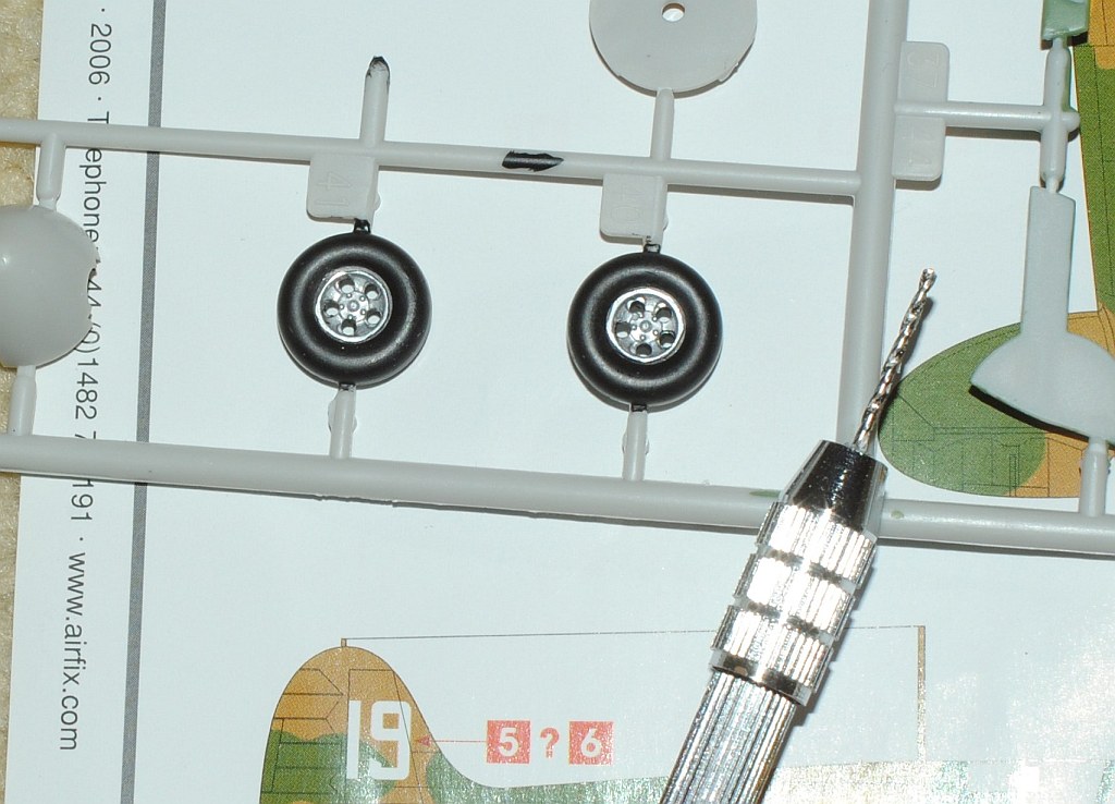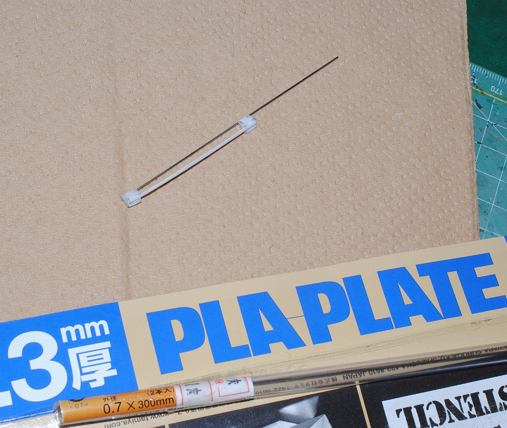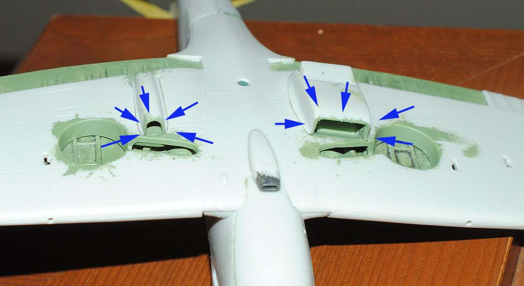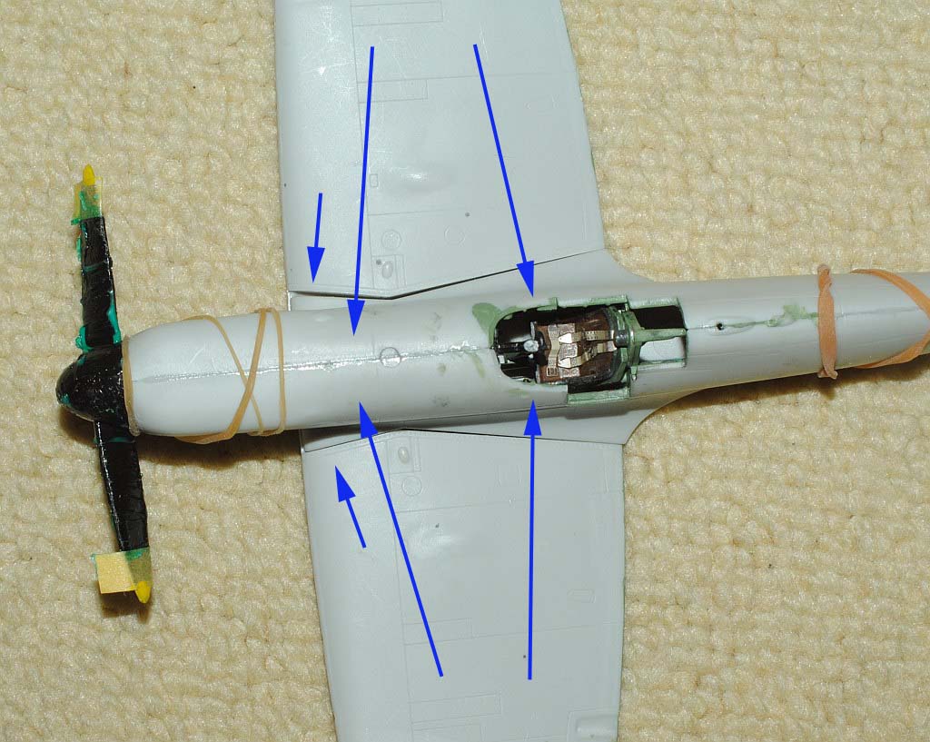 2012.12.08-09. Before the upper and lower main wing is glued, the trailing edge of the inner side of the main wing is sanded to a thinner edge (the original is really meaty dull). As indicated at hyperscale.com page by Mr. Brett Green, in order to fill a gap between the wing and fuselage at the wing root, the width of the lower fuselage needs to be widened by impromptu spread bar (glued, blue arrows), the length of which must be adjucted by trying and figuring out. Upper view of trial assembly of the fuselage and the main wing - The length of the bar must be adjusted simultaneously for a proper dihedral angle of the main wing and no gap to be achieved when main wing is folded in the blue-arrow direction. Holes are bored to the wheel hub of the main undercarriage using pin vice, after painting in black and silver.