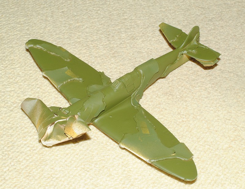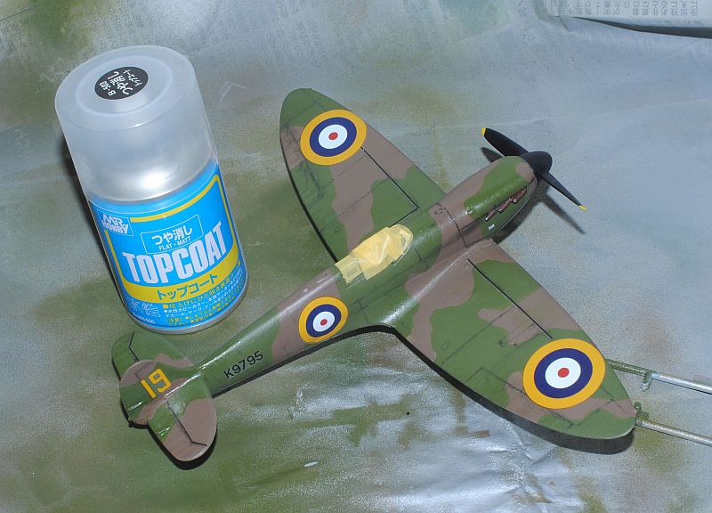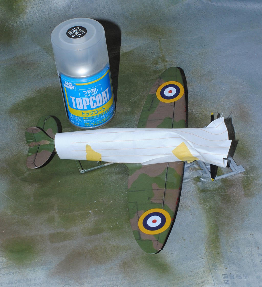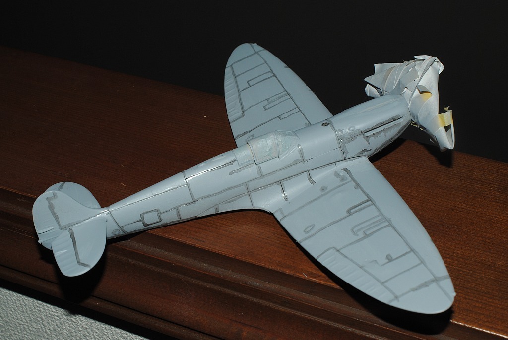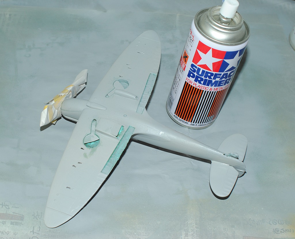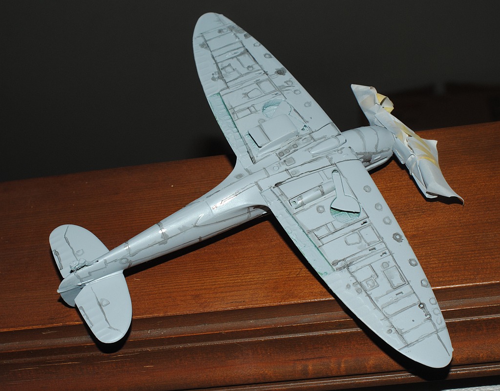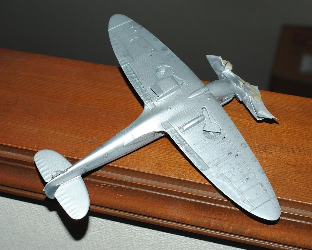 2013.1.12-14. After masking the canopy, surface primer is sprayed. Panel lines are roughly traced with diluted Tamiya X-19 "Smoke" - upper surface, and lower surface, followed by. flat silver being sprayed on the lower surface.