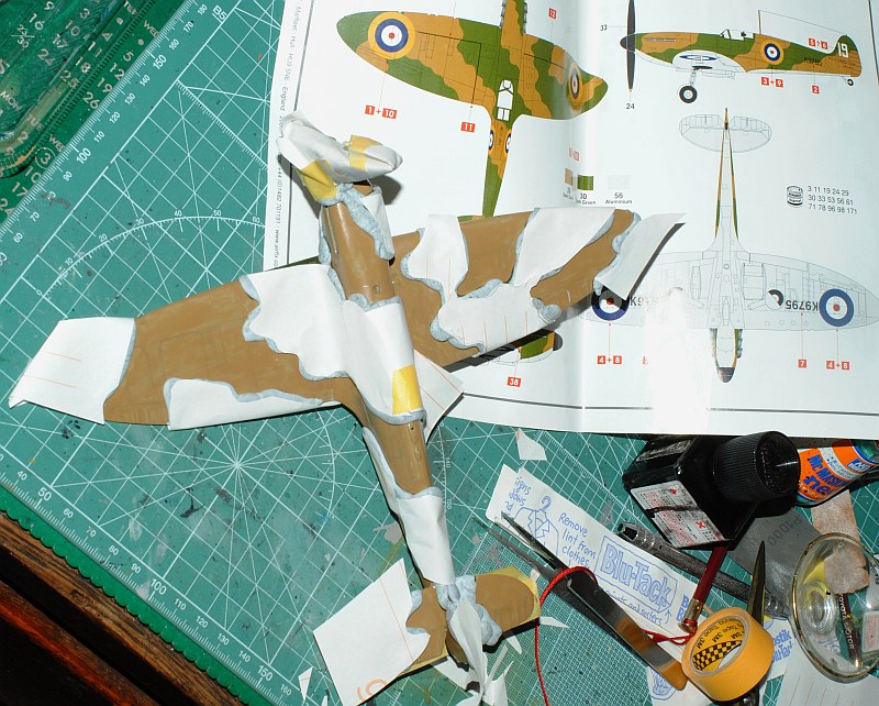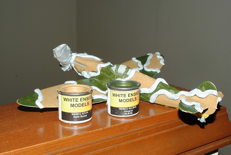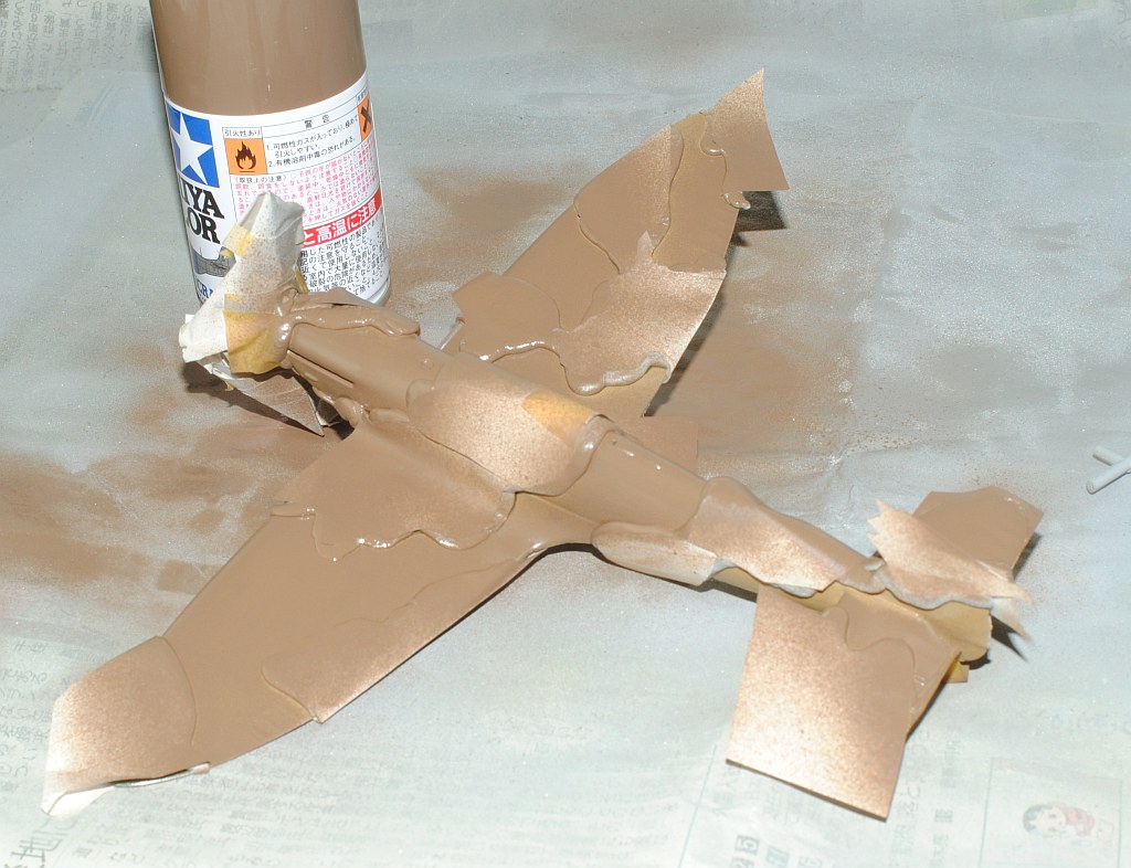 2013.2.9-11. Upper surface comouflage painting starts. Firstly I try brush painting, using White Ensign ACJ14 "Earth Brown" (actually for WW2 Japanese planes) and ACLW19 Olivegrun RLM 80 (actually for WW2 Luftwaffe). I happened to come across these two cans on special sale at Akihabara, and purchased from curiosity, however, these revealed too thin for amatuer brush painting, it seems. Probably these are suitable for spray painting. I appreciate to receive information re. how to utilize these authentic-brand paints. Then anyway, I change the course to familiar Tamiya spray painting, and as before parting line was set using Blu-Tack covered with masking paper, the same procedure as performed on Gloster Meteor (Tamiya 1/48) on April 14 2012. Dark earth (TAMIYA AS-22) is sprayed this week.