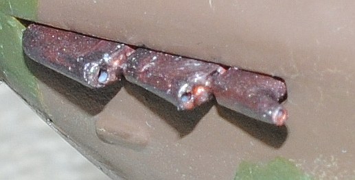 2013.2.23-26. Upper surface is weathered with MIG Pigments Wash, which is very thinnly-mixed with water and wiped off, again, again, once again. Ports of 7.7 mm machine guns are painted red (1/2 flat red + 1/2 flat base, Tamiya) after masking with tapes. Upper and under surface panel lines are again traced with Tamiya's panel line accent color. "Fishtail" exhaust manifold is painted with brush; Tamiya's surface primer liquid --> Mr.Color No.215 Copper --> ditto. No.61 Case-hardened Steel, ditto the other side, ditto closed-up view, which reveals roughcast. Take notice that this is still preliminary step.