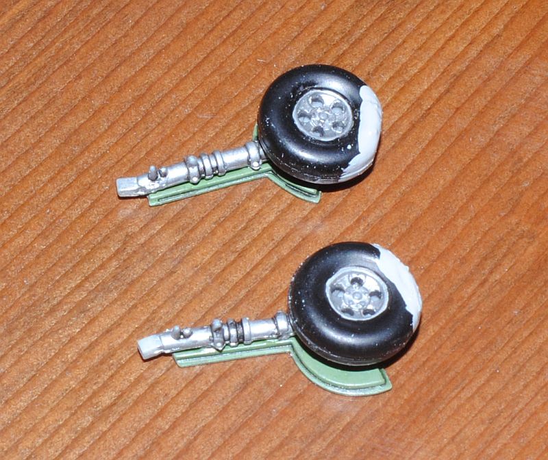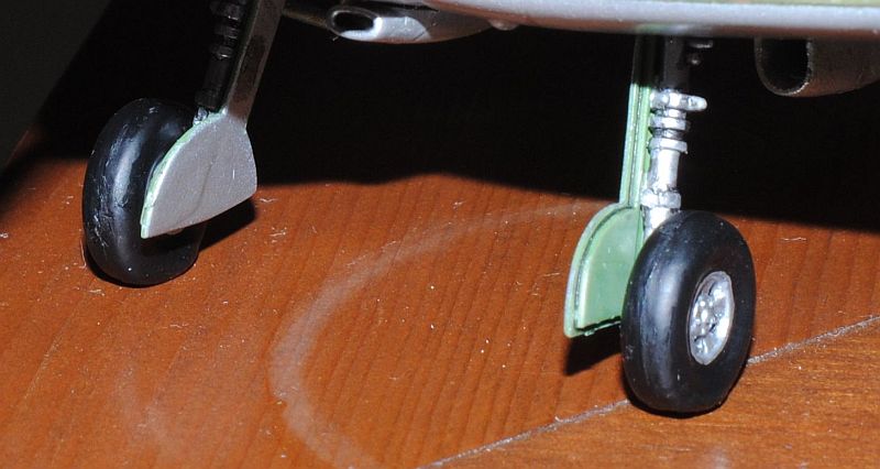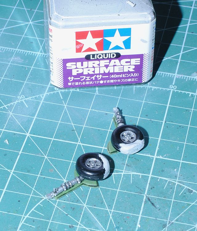 2013.3.9-3.10. At temporary assembly of undercarriage, I am not satisfied with original tyre parts which are simply molded in circle, so I retrofit them into deformed shape due to compression by gravity. Firstly the base is trimmed with sand paper, then roughly swelled laterally with putty, and brushed with Tamiya surface primer. The results look pretty good form (I fix parting line of tyres later with sand paper).