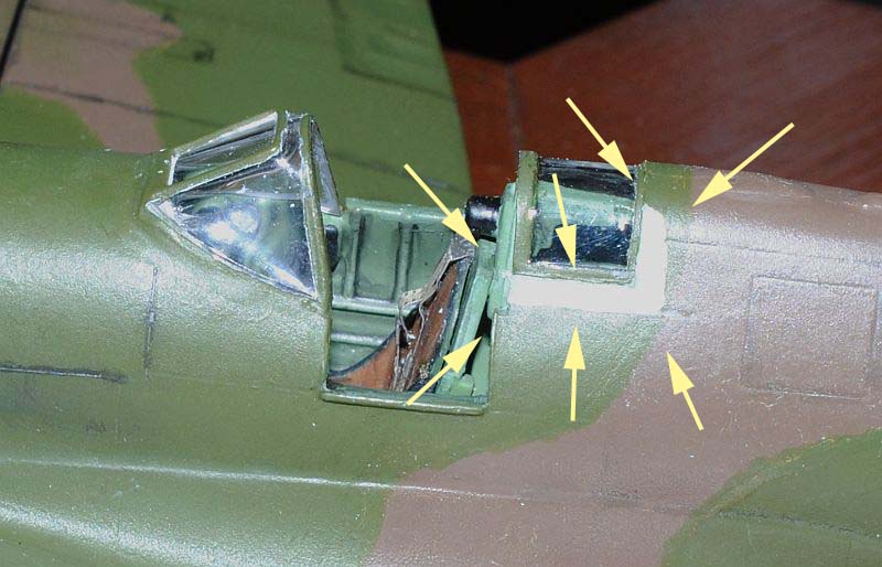 The underside of the cockpit aft glazing is grinded down (yellow arrows) with chisel in order to lessen upward bulge of plexglass canopy in opened (backward) condition. This is not completely corrected, and ideally I should make the plexglass canopy anew with thin tranparent Celluloid. After flaps are glued and remaining decals are applied, the entire airframe is sprayed with My Hobby's clear matt Topcoat. Entry flap to the cockpit is glued - Photo-1, Photo-2. The underside is checked. The remaining task is to install aerial mast with delicate and risky IFF aerial wiring. Anyway, so far, so good.